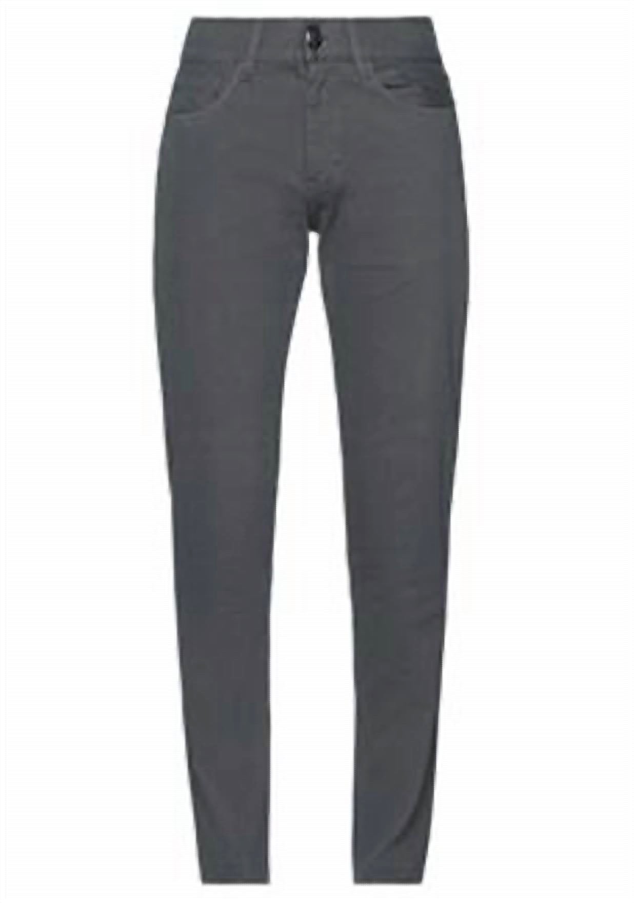 These bottoms are crafted for a regular fit with a mid-rise waist and a tapered leg silhouette. They are made from comfortable gabardine fabric in a solid color that offers stretch due to the blend of 98% cotton and 2% elastane. The design includes five pockets and secures with a zipper closure.