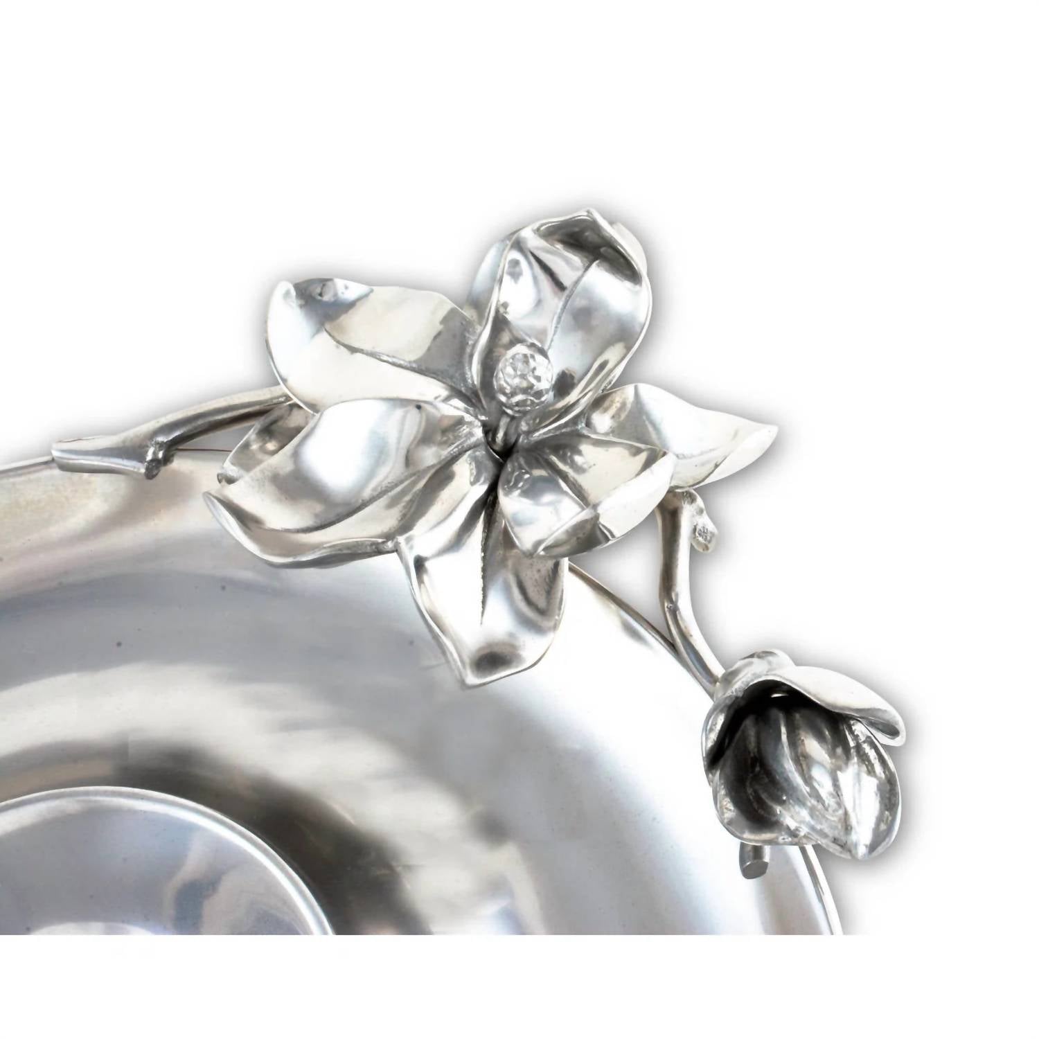 The Magnolia Chip and Dip Tray by Arthur Court Designs adds elegance to your entertaining with its stunning single magnolia blossom detail. Crafted from durable aluminum, this silver serving dish combines functionality with sophisticated design. Dimensions: 14 inches long, 14 inches wide, and 4 inches high. Perfect for adding a touch of class to your gatherings.