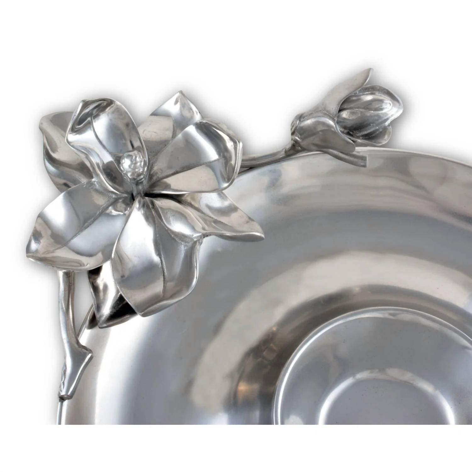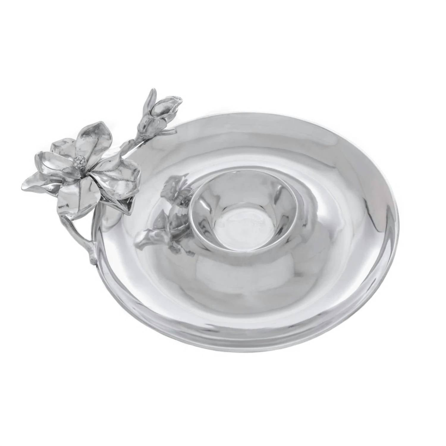 Presenting the Magnolia Chip and Dip Tray by Arthur Court Designs, a beautifully crafted piece that combines functionality and elegance. Made from durable aluminum, this tray features a single magnolia blossom, making it a striking centerpiece for any gathering. Its generous dimensions of 14 inches in length, 14 inches in width, and 4 inches in height offer ample space for serving. Perfect for any occasion, this tray is a showstopper that will earn you endless compliments.