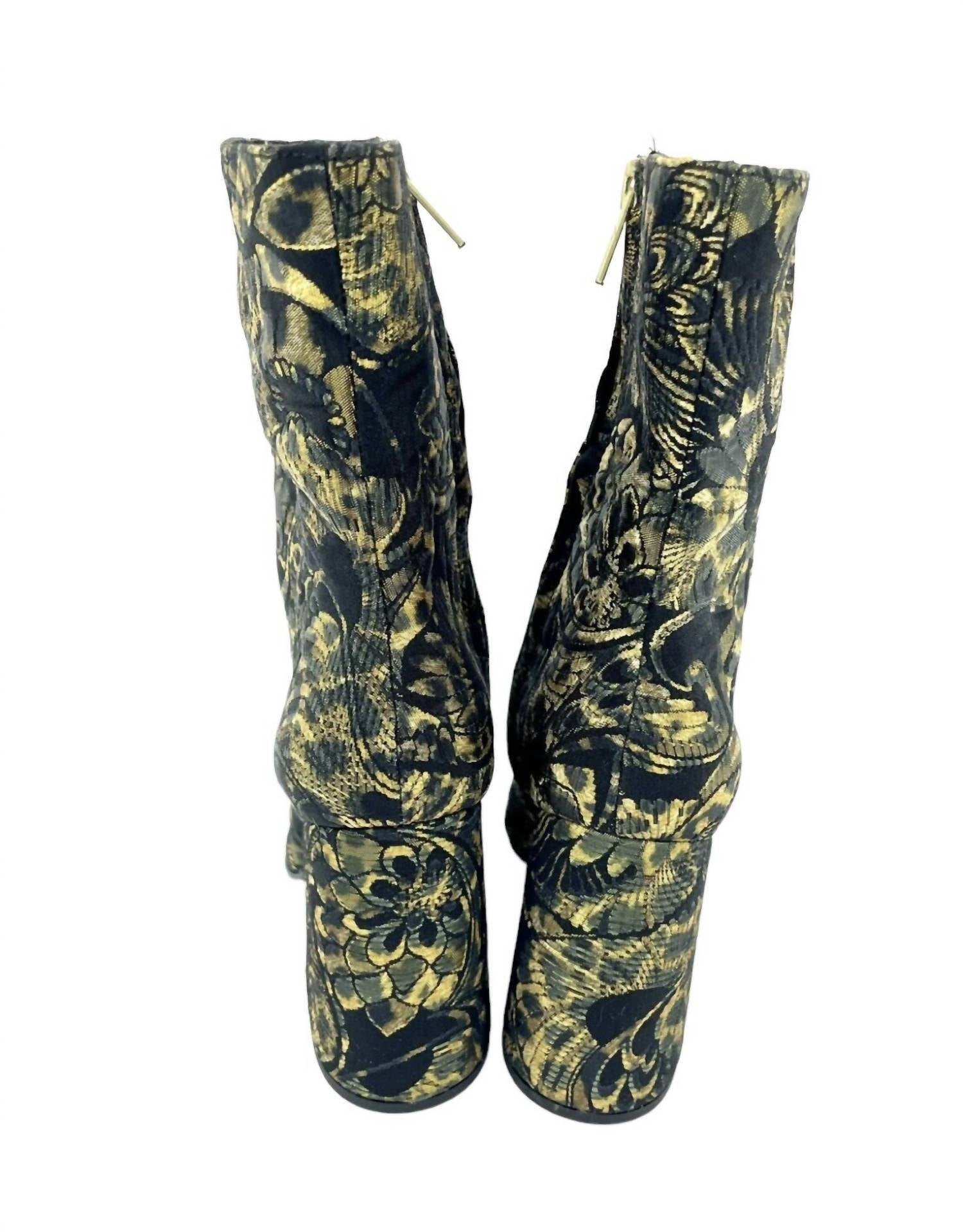 Say hello to the perfect, most versatile boot. The ankle height makes this style easily transition from day to night. Wear them with your favorite skinny jeans and tee for a more laid back look, or pair them with your favorite mini dress and jacket for a night out on the town. Dress up your winter outfit with these elegant metallic jacquard boots featuring Floral print in gold and black Side zipper closure Almond toe and covered block heel Fabric upper, leather lining and sole