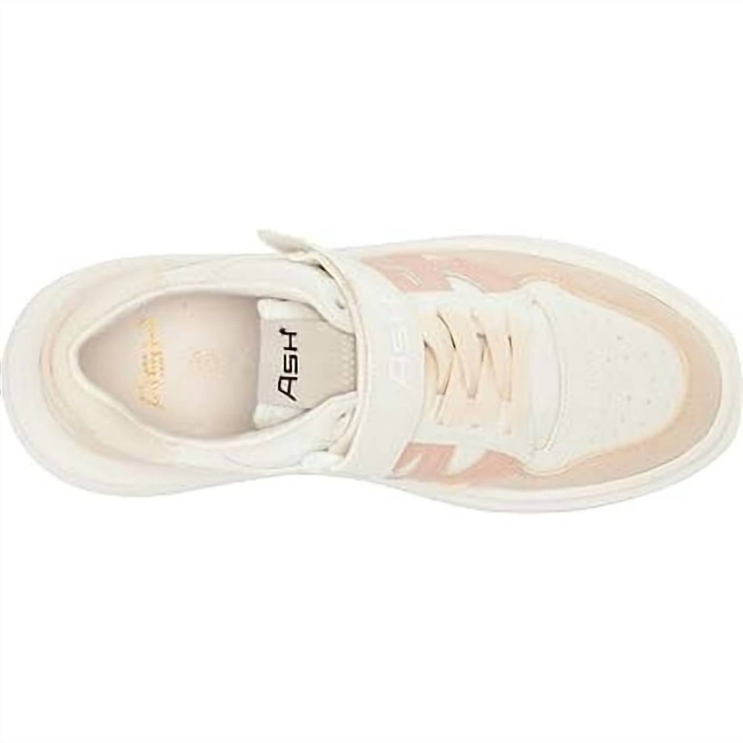 Bonitos, funcionais e confortáveis. Estes tênis atendem a todos os requisitos. Entre no estilo com o Tênis Feminino Indy Lace Up da ASH, na elegante combinação de cores Eggnug/Branco/Pinksalt. Confeccionado em couro de alta qualidade, este tênis possui cabedal durável e solado plataforma em camadas para maior altura e um toque moderno. Projetado com fecho em cadarço e uma tira de suporte sobre os cadarços, este tênis garante um ajuste seguro e confortável, enquanto o solado de borracha oferece excelente tração em diversos terrenos.
