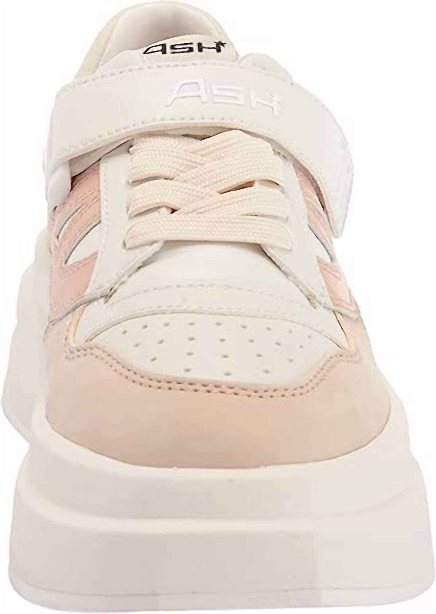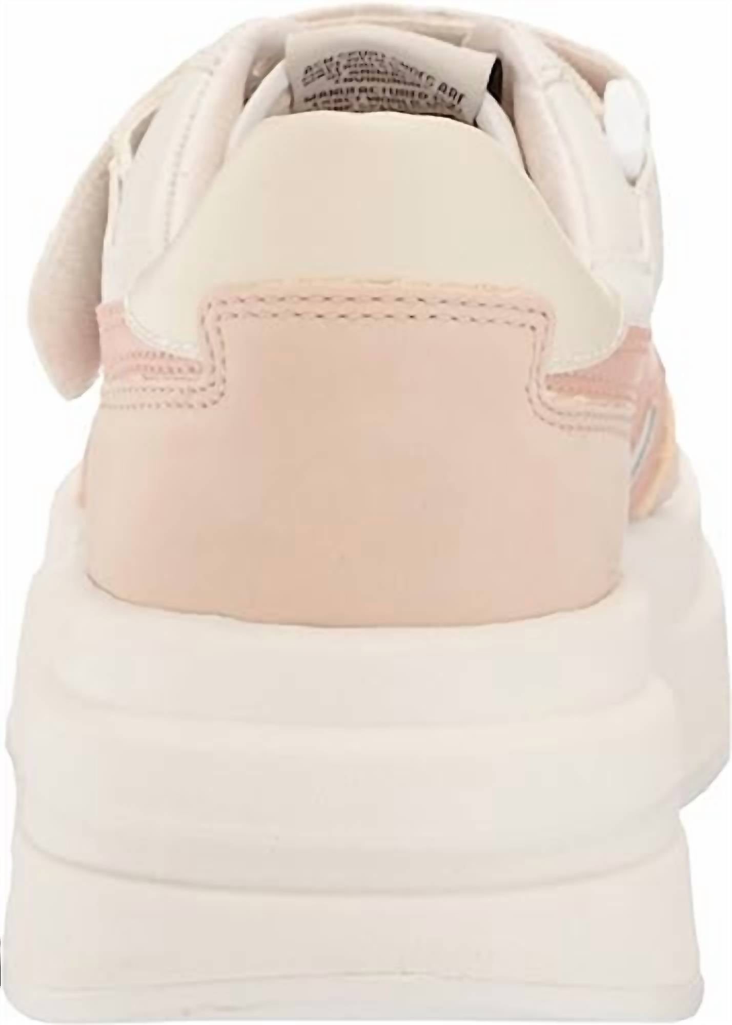 Entre no estilo com o Tênis Feminino Indy Lace Up da ASH, na elegante combinação de cores Eggnug/Branco/Pinksalt. Confeccionado em couro de alta qualidade, este tênis possui cabedal durável e solado plataforma em camadas para maior altura e um toque moderno. Projetado com fecho em cadarço e uma tira de suporte sobre os cadarços, este tênis garante um ajuste seguro e confortável, enquanto o solado de borracha oferece excelente tração em diversos terrenos.