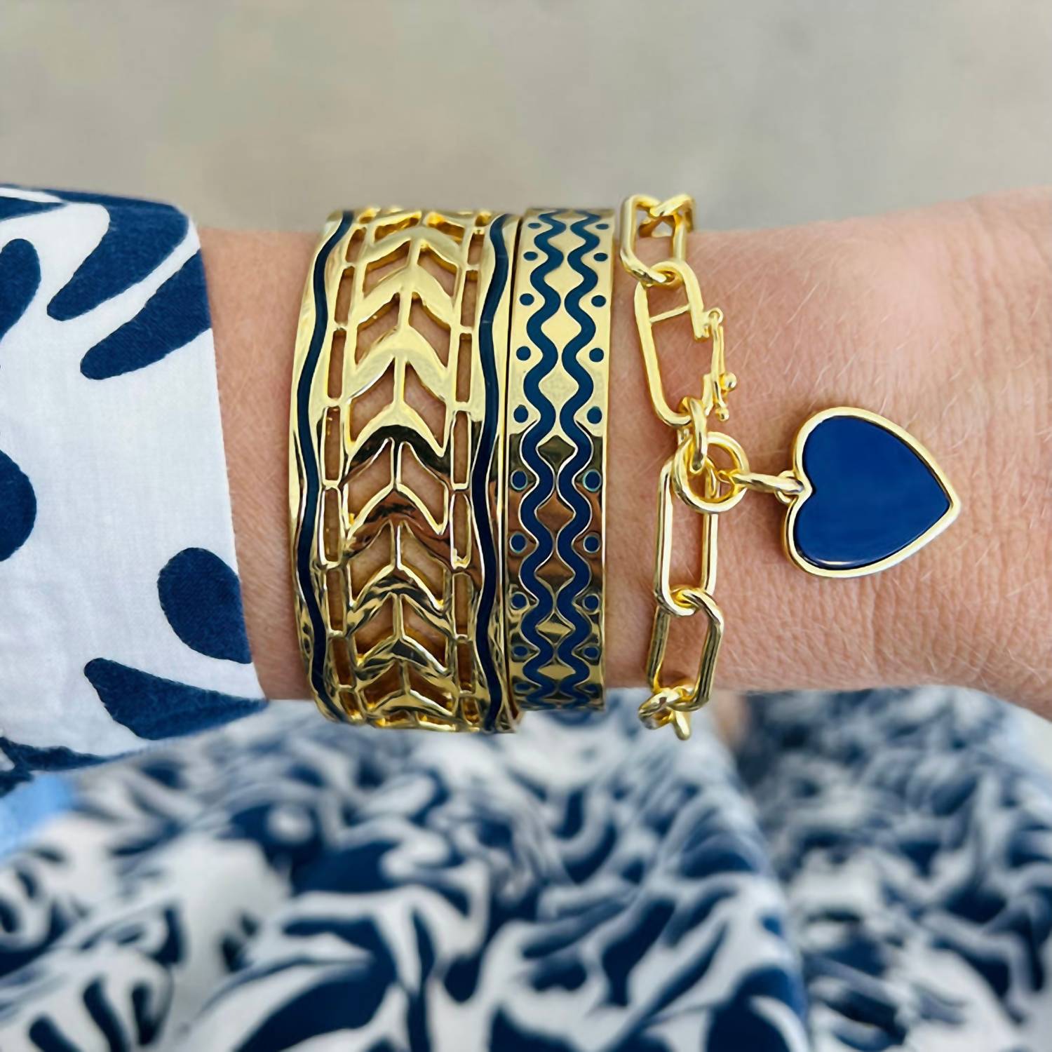 Esta pulseira de destaque é boa o suficiente para ser usada sozinha ou combinada com suas favoritas. Eleve seus acessórios com a Pulseira Feminina Skinny Cala da ASHA, um complemento elegante para qualquer look. Feita em ouro amarelo 14k, esta pulseira fashion apresenta um design elegante com detalhes em esmalte azul-marinho, adicionando um toque de cor. Perfeita para usar em camadas ou sozinha, esta pulseira exala elegância discreta. Uma peça versátil que complementa facilmente looks casuais e formais.