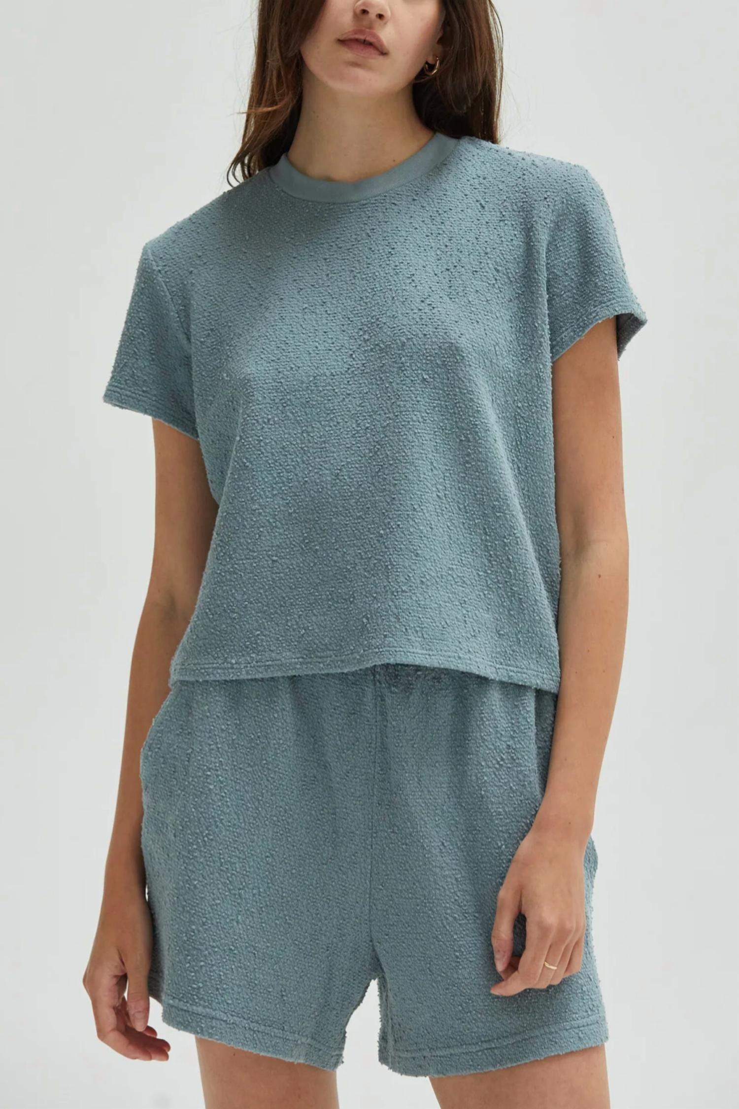 Elevate your casual wardrobe with the Asher Aurelie Sport Short in Ocean, a chic addition for leisure and travel. Crafted from 100% Boucle Cotton Fleece, these shorts offer a soft hand feel thanks to garment-dying and enzyme & silicon washing. They feature an elastic waistband with a cord drawstring and convenient side seam pockets. Made in LA, these pull-on shorts are machine washable and can be tumble dried, ensuring easy care.