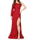 This long-form gown is designed with a fitted silhouette, featuring a single long sleeve on one side and an asymmetrical one-shoulder neckline. The exterior is constructed with full hand-beading, creating a heavy-weight, textured surface across the entire garment. For added structure and volume, the hem of the skirt is finished with horsehair braid, which allows the fabric to hold its shape and flare away from the feet. The design is completed with a high slit on the left leg to allow for better movement within the slim-cut skirt.