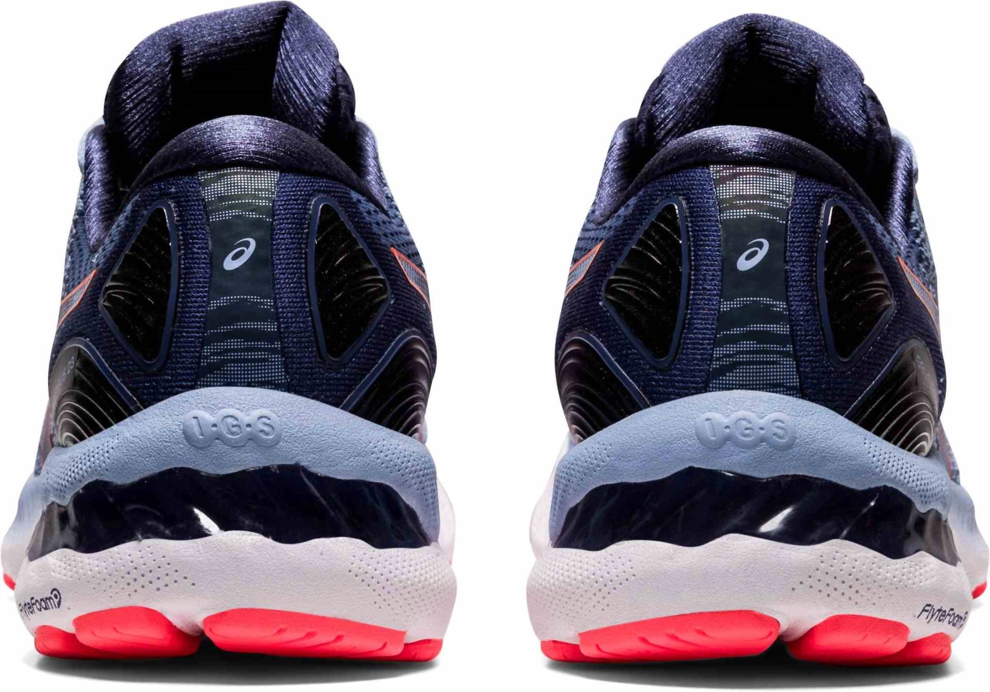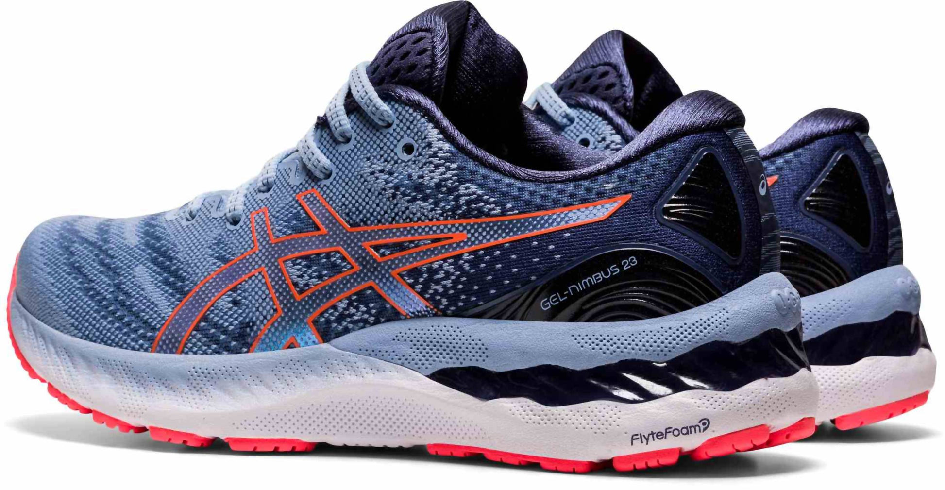 Discover the ASICS Men's Gel Nimbus 23 Water Resistant Sneakers, expertly crafted for optimal support during long-distance runs. These light blue and coral sneakers feature a breathable mesh upper and a round toe shape, ensuring superior comfort. Enhanced with GEL cushioning, TRUSSTIC technology for stability, and FLYTEFOAM Propel for a responsive stride, they offer unmatched performance and durability. The AHAR LITE rubber outsole, ORTHOLITE X-60 liner, and reflective elements provide durability, comfort, and safety, making them perfect for your summer game day adventures.