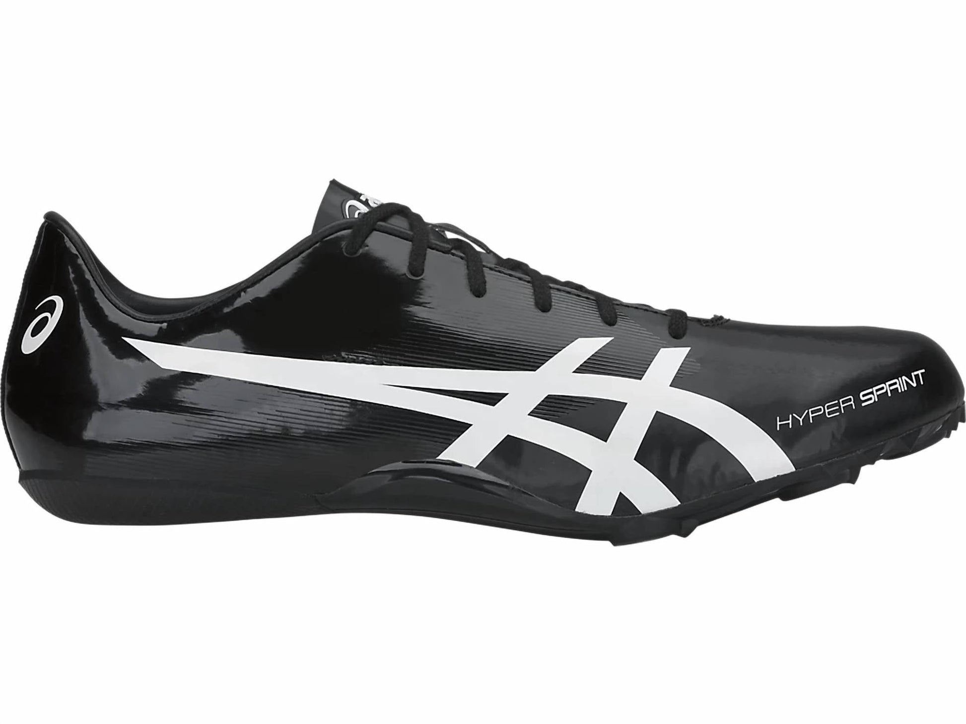 Step into speed with the Men's Hyper Sprint 7 Track Shoes by ASICS, designed for entry-level short-distance runners. These black and white athletic shoes feature a sleek no-sew film construction for added reinforcement and a snug fit. Equipped with a 4 mm heel drop, they weigh only 170 g (6 oz) and include board lasting, a rubber outsole, EVA sockliner, pin spikes, and a resin plate for superior propulsion and grip on the track. Elevate your performance with this essential track companion.