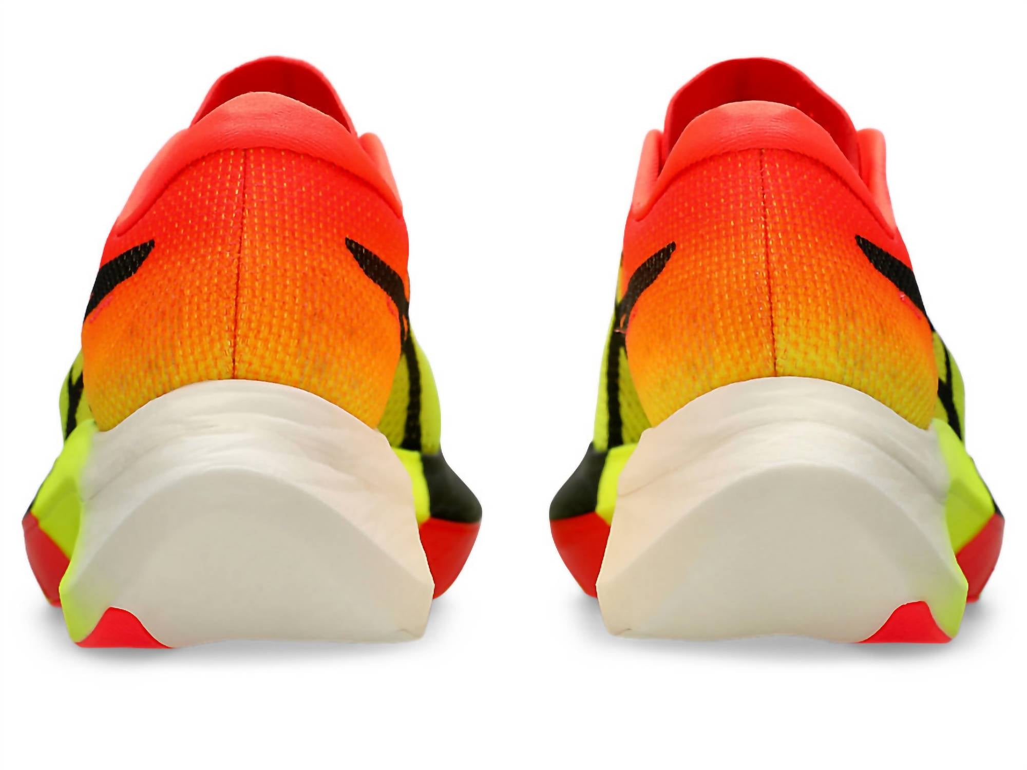 Introducing the ASICS Men's Metaspeed Sky Paris Running Shoes in a vibrant Safety Yellow/Black, engineered for stride-style runners seeking top-tier performance. These athletic shoes boast a lighter construction enhanced by FF TURBO™ PLUS cushioning for superior compression and energy conservation. A carbon plate and curved sole design work in tandem to guide and propel your foot, providing an impressive energy-saving advantage during fitness workouts. With advanced ASICSGRIP™ outsole rubber for unparalleled traction across various terrains, these shoes feature sustainable elements, including recycled upper materials and an eco-friendly dyeing process, underscoring a commitment to reducing environmental impact.