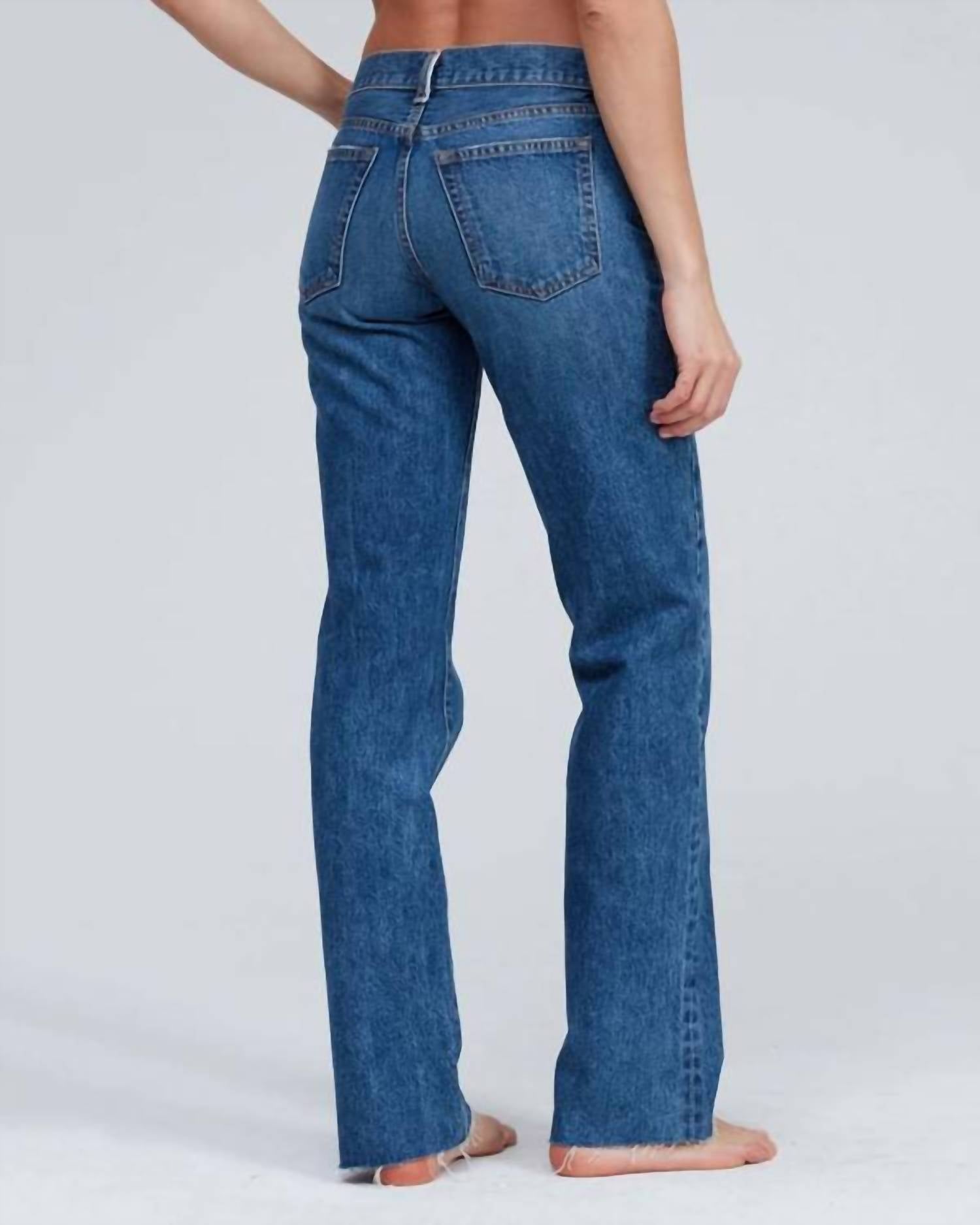 Calça jeans feminina longa, cós baixo e reto, na cor Sundowner. Cós baixo. Perna reta. Barra sem acabamento. Modelagem com cinco bolsos. Jeans que não estica. Lavar à máquina com água fria, separadamente; secar no varal. Costura interna de 84 cm.