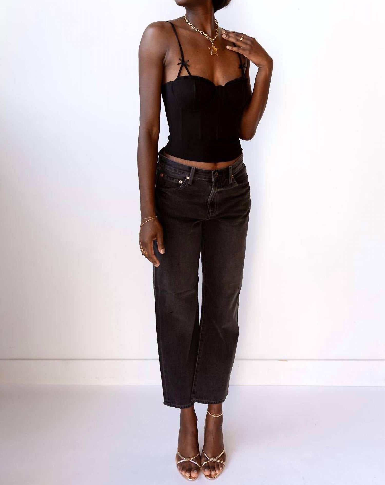The Adana Top by ASTR is a flirty, fun piece that effortlessly complements both casual and chic ensembles. With spaghetti straps and a sweetheart neckline, this crop top showcases subtle bow details for added charm. This solid black piece comes with a convenient zip closure. Care for it with a hand wash as recommended. Zori is wearing a size small, and it runs true to size.