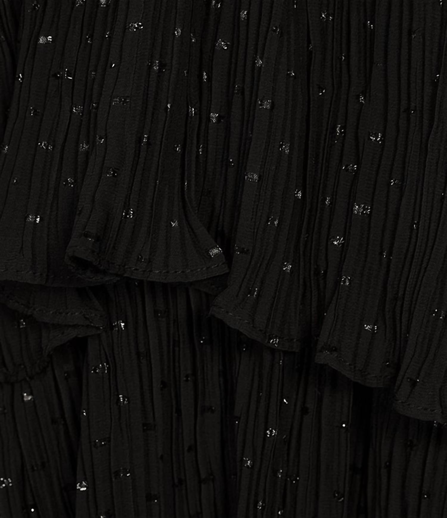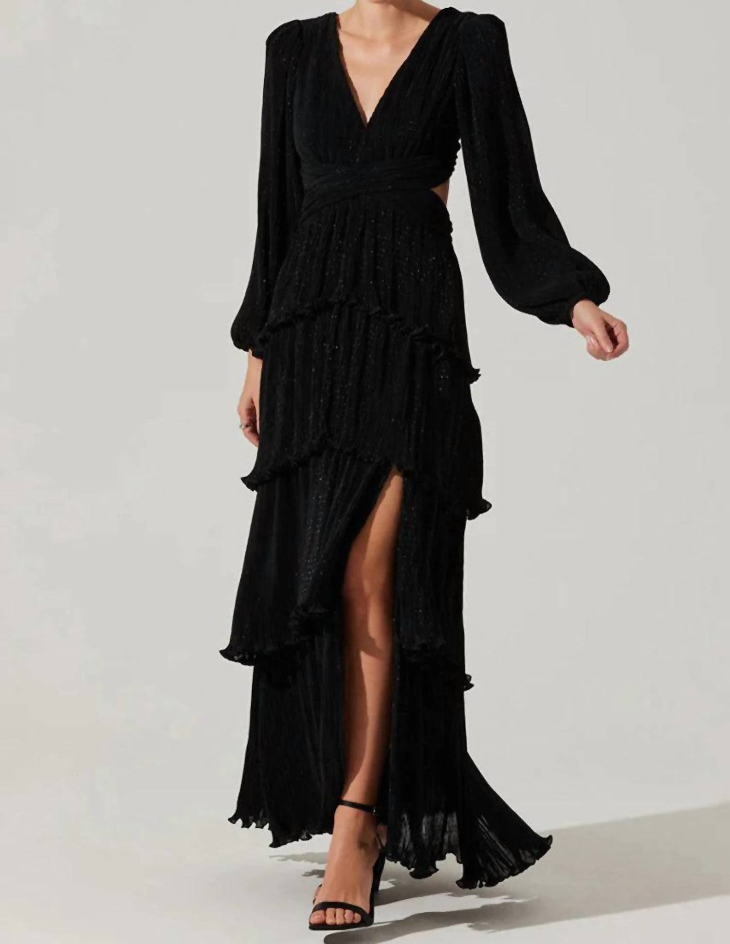 Step into elegance with the Anora V-neck Pleated Tiered Maxi Dress by ASTR the Label, a perfect blend of sophistication and contemporary style. This black maxi dress features long sleeves and a chic cutout back with ties, adding a unique twist to its classic silhouette. Crafted from polyester, it showcases a textured pattern and a flattering A-line design, ideal for occasions like dinner parties or New Year's Eve celebrations. Designed with a convenient zip closure, this imported piece requires dry cleaning to maintain its luxurious feel and appearance. Self: 100% Polyester / Lining: 100% Polyester,