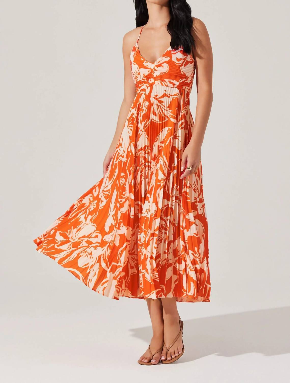 Just add slides or mules and you are good to go. Embrace the vibrant Boho Chic style with the Blythe Floral Plisse Midi Dress by ASTR, a standout for any holiday party or Easter event. Showcasing spaghetti straps and a stylish plunge neckline, it features a strappy cutout back and an elegant fit and flare silhouette. Crafted from 100% Polyester, this dress boasts a concealed zipper closure and adjustable tie strap details for a personalized fit. Care instructions recommend hand washing and line drying to maintain its radiant hot orange floral pattern.