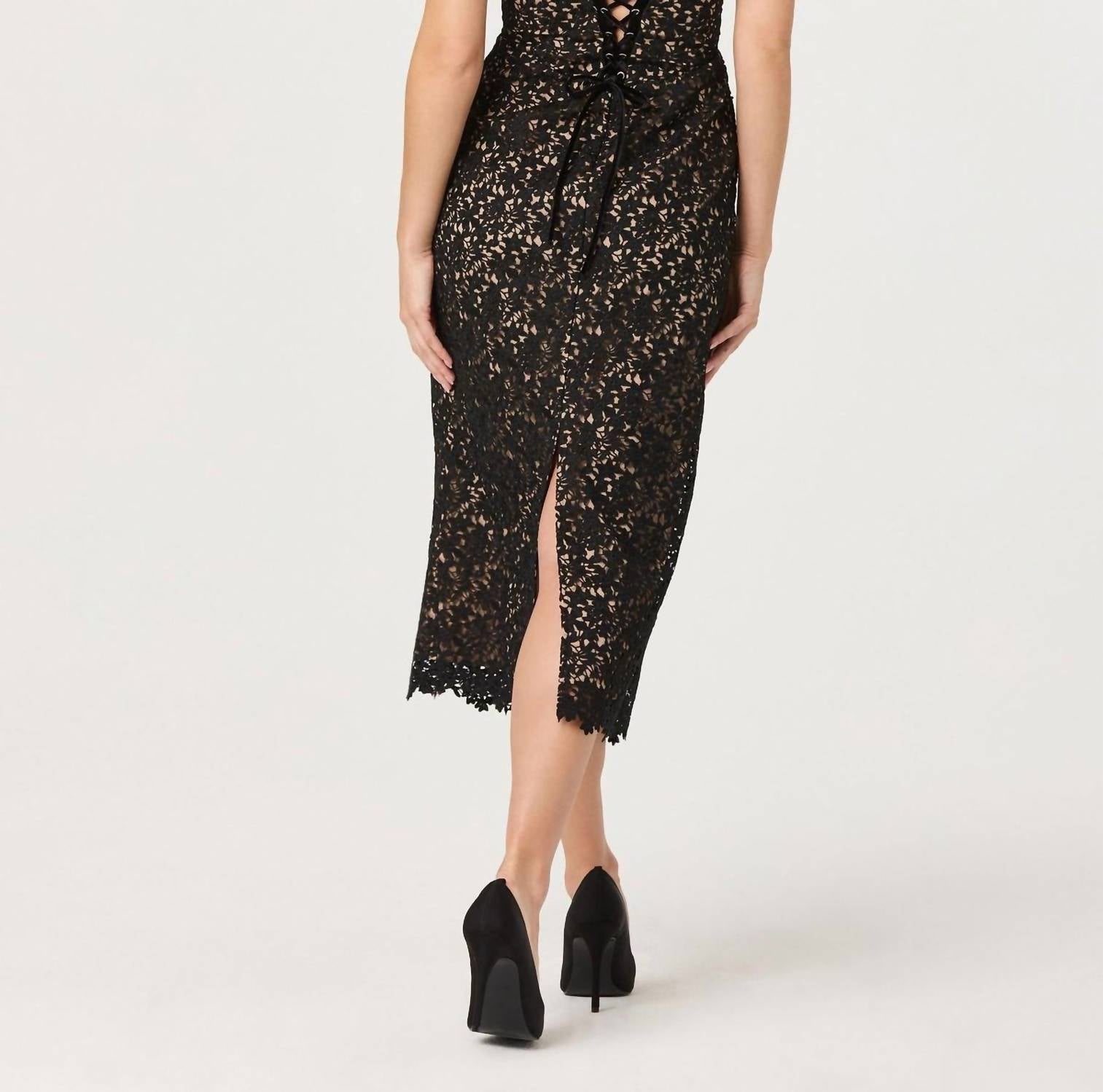 The Donne Floral Lace Midi Dress by ASTR in Black Nude is an elegant choice for any special occasion. This sleeveless dress showcases intricate floral lace over a nude lining and a flattering sweetheart neckline, complete with velvet self-tie bow straps for a feminine touch. Made of 100% Polyester with a 90% Polyester and 10% Elastane contrast, it includes sewn-in cups with underwire, a lace-up back, and a concealed side zipper closure. Length: 48.5"; Bust: 32"; Waist: 28". Care: Dry clean only. Model is wearing a size small at a height of 5'8".