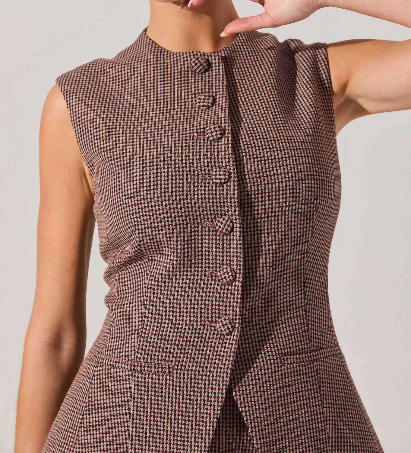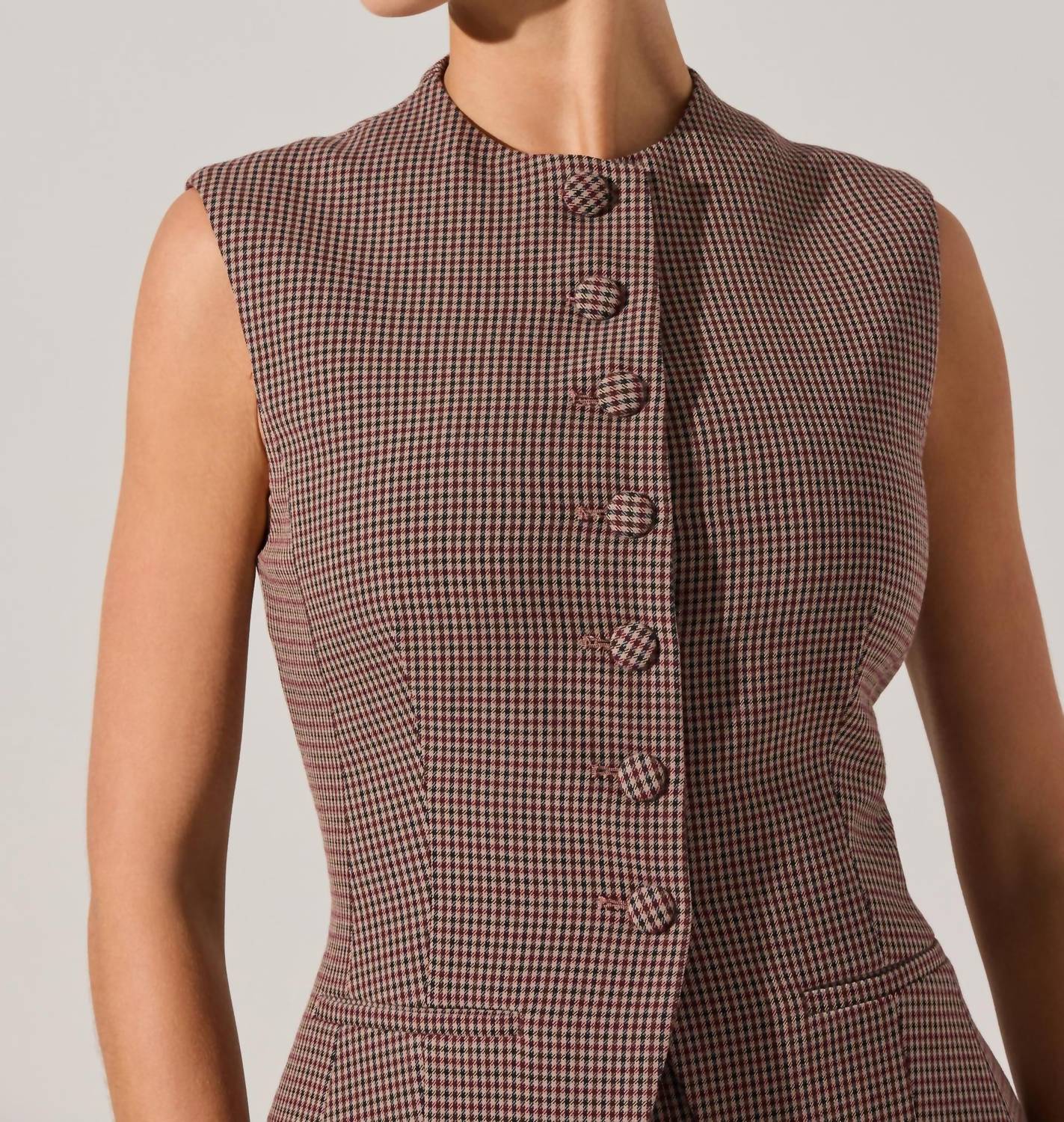 A vest so versatile you can mix and match it with almost any outfit and it will feel brand new every time. The Giselle Vest by ASTR the Label showcases a chic minimalist design with a structured high neckline and cutaway sleeves, perfect for a Fall dinner party. Its brown, patterned fabric offers effortless polish with a composition of 90% Polyester, 6% Viscose, and 4% Elastane. This tailored piece features functional front pockets and a button closure, adding to its feminine and refined feel. Care is simple with dry clean instructions, ensuring your vest maintains its pristine look. Model is wearing a size small, and the vest is imported.