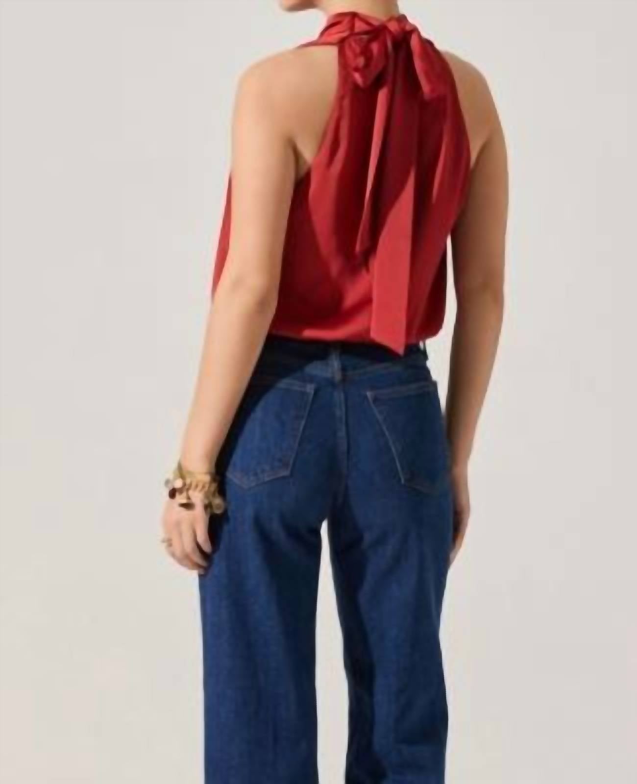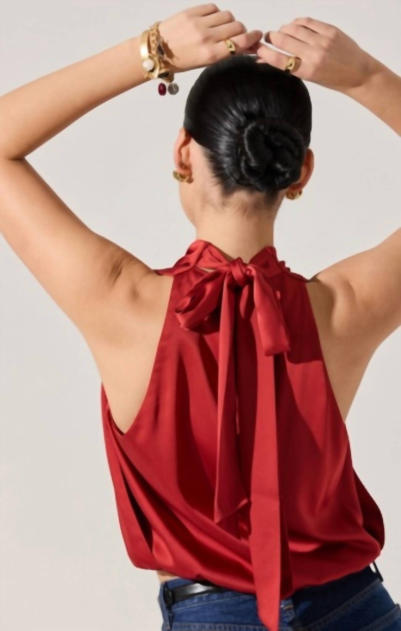 Elevate your holiday party ensemble with the Joleisa Satin High Neck Top by ASTR, a sophisticated sleeveless blouse in a striking rust hue. Crafted from 100% polyester and measuring 20.5 inches in length, this top features a chic adjustable tie neck scarf and an elegant keyhole cutout at the back with a button closure. Its fully lined design and elasticized hemline ensure a refined yet relaxed fit. For care, this piece requires dry cleaning only, maintaining its impeccable appearance season after season. Model is wearing a size small and has a height of 5'8".