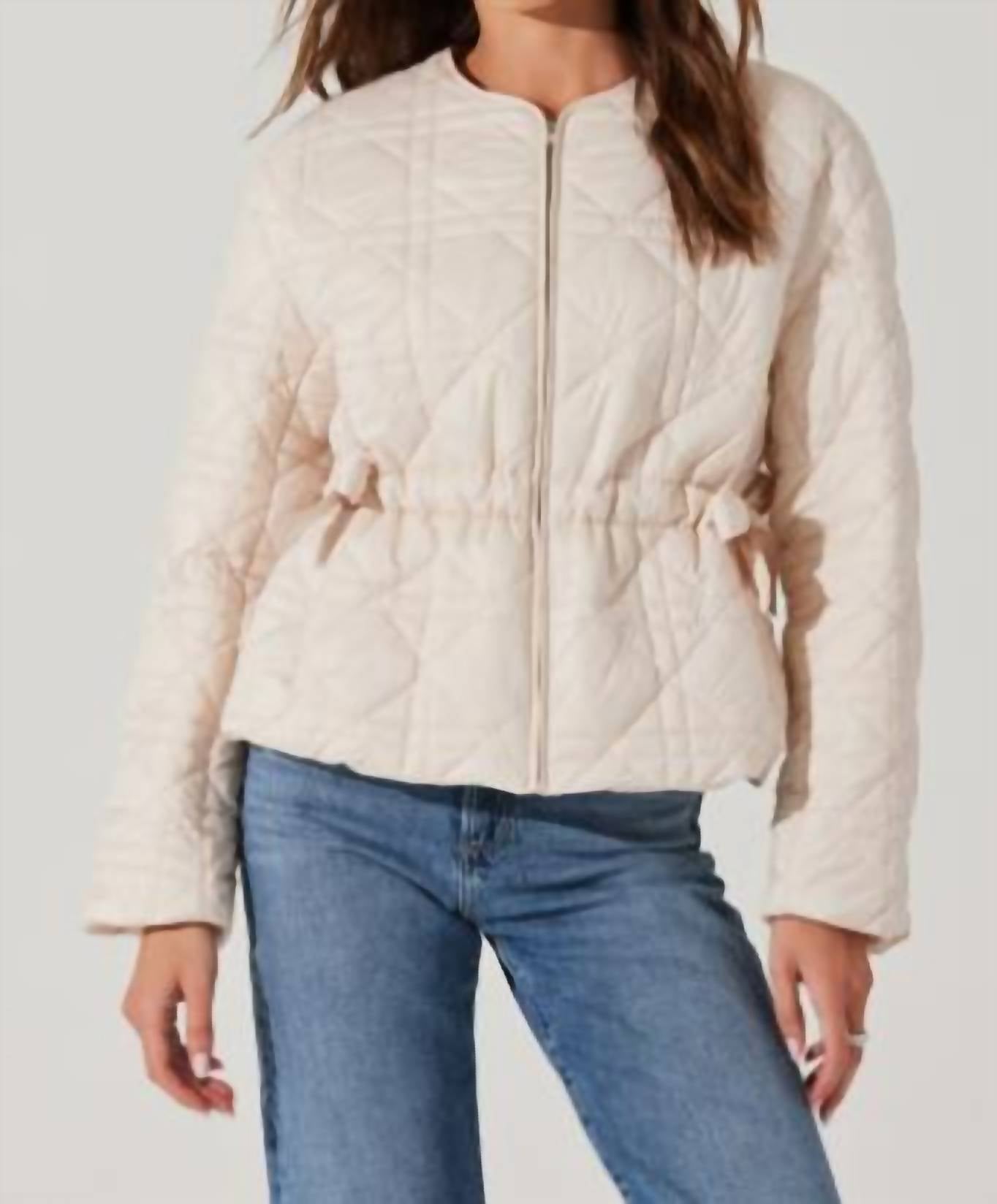 Elevate your winter wardrobe with the Joslyn Diamond Quilted Jacket by ASTR, designed for minimalist sophistication. This beige jacket features a collarless round neckline and long sleeves, while the adjustable side ties offer a customizable fit. It's constructed from 100% polyester for the self, lining, and filler, with a practical zip closure and functional front pockets. Fully lined and perfected with an exposed front zipper, this jacket requires dry cleaning only. Model is wearing size XS (5'9" height).