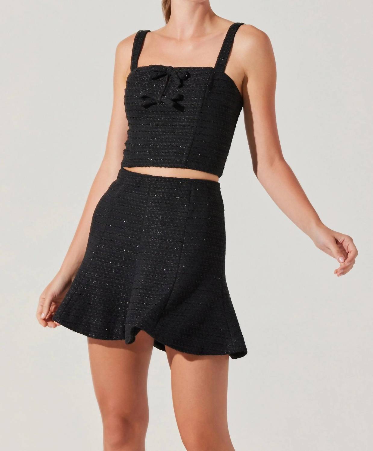 Loungewear doesn't have to be frumpy and this is exactly what we had in mind. Designed for a comfortable fit, this chic little number will be your favorite lounging-at-home look. Elevate your loungewear collection with the ASTR Kiona Tweed Bow Set in Black. This sleeveless set, featuring a tweed bow top and fit and flare mini skirt, is crafted from 100% polyester and fully lined for added comfort. The top boasts a decorative double bow detail, a keyhole opening at the center bust, elasticized back, and exposed zipper closure, while the skirt offers a concealed back zipper. Designed for occasion-ready style, this maximalist set is perfect for a spring dinner party and requires dry cleaning to maintain its shimmer.