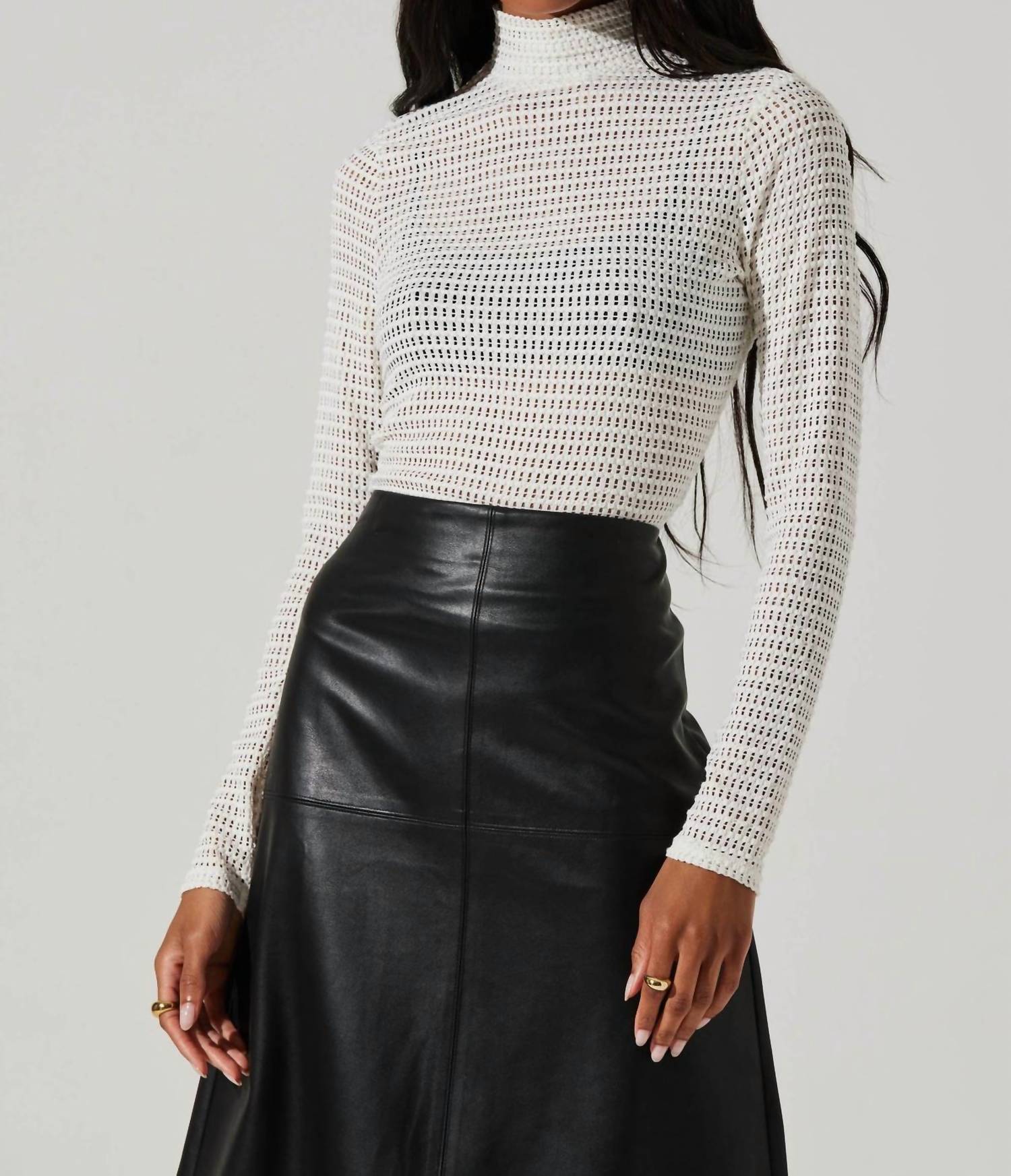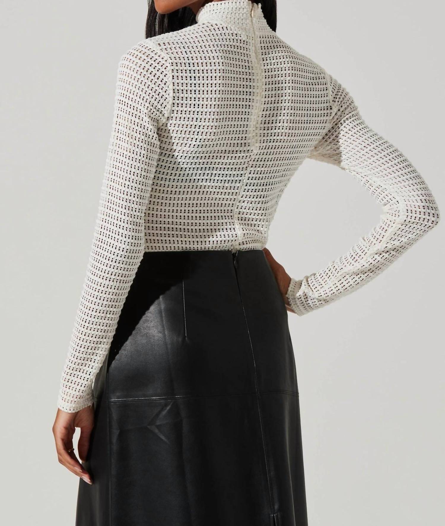 Elevate your spring wardrobe with the Cream Lida Open Knit Top by ASTR, perfect for holiday parties or a minimalist Thanksgiving look. This women's top features long sleeves and a chic mock neck design, offering both elegance and comfort. Crafted from a 90% Nylon and 10% Elastane nylon blend, its concealed center back zipper ensures a sleek, seamless fit. With a garment length of 22.25 inches, it is recommended to hand wash cold, line dry, and iron low if needed. The model is wearing a size small and measures 5'10" in height.