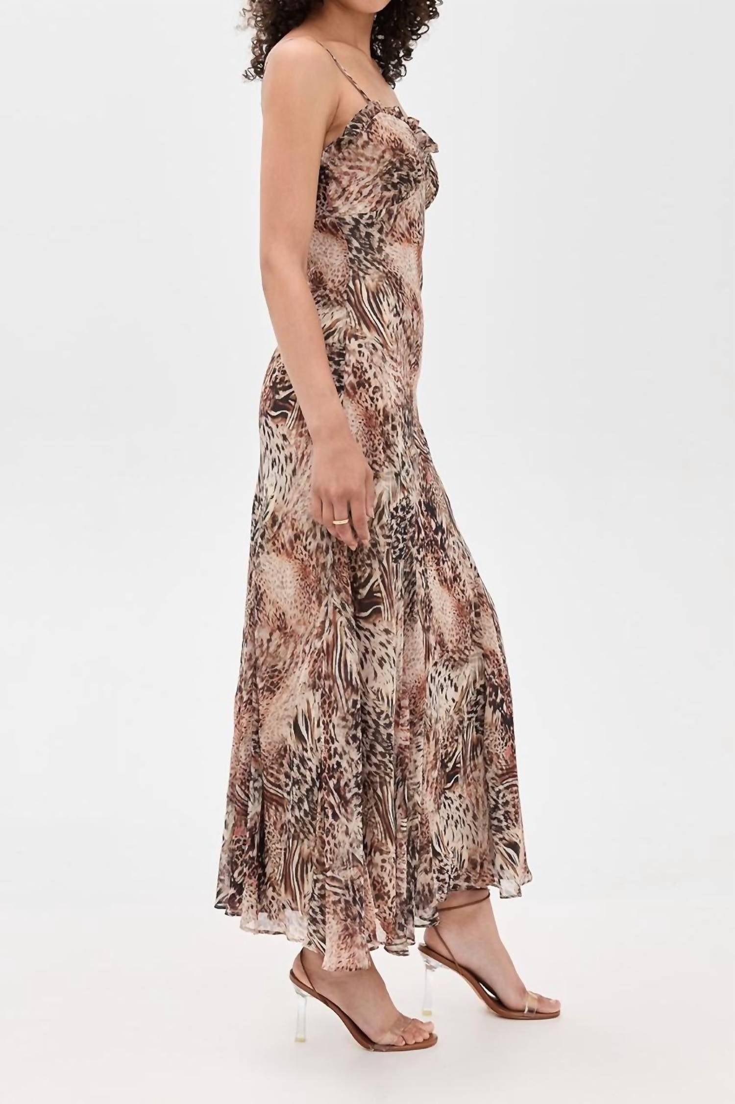 A maxi dress that is just as cute as it is comfortable. Embrace chic elegance with the Maeryn Ruffle Maxi Dress by ASTR, adorned in a Taupe Brown Leopard print. This boho chic piece features delicate spaghetti straps and a whimsical godet-skirt silhouette, accented with ruffle trim for a flirty touch. With a luxurious fit, it offers a sweetheart neckline and a secure fit courtesy of its hook-and-eye, hidden side zipper closure. Made from 100% polyester chiffon with lining, this dress ensures comfort while maintaining a sophisticated look; best cared for with dry cleaning. The dress boasts an impressive 56in / 142.0cm length from the shoulder, made in China.