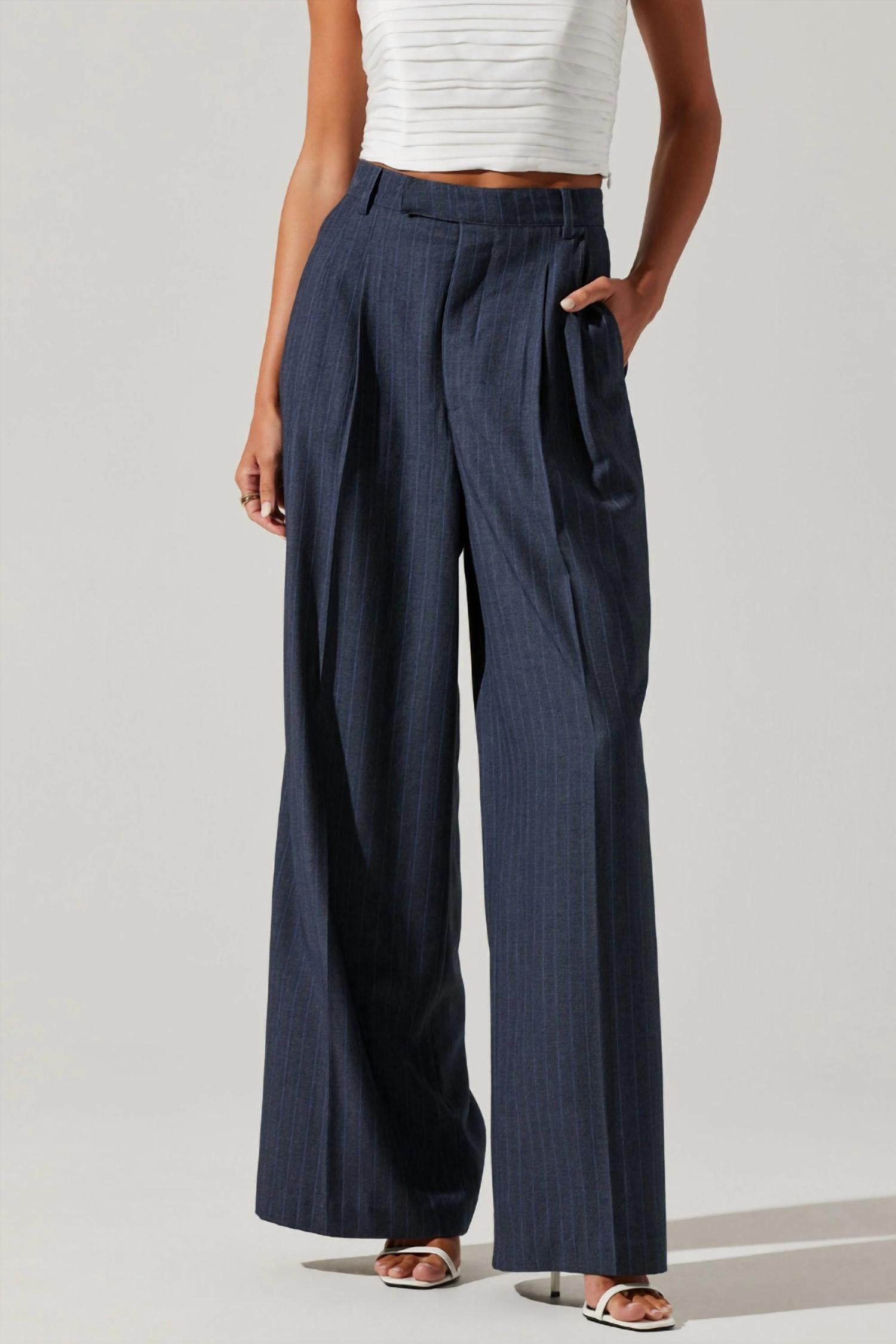 The ASTR Milani Wide Leg Trouser Pants bring a sophisticated flair to any wardrobe. These high-waisted, full-length trousers in a chic blue pinstripe pattern feature a pleated front and a wide-leg silhouette. Crafted from 68% Polyester, 28% Viscose, and 4% Elastane, they offer a relaxed fit with functional side pockets and faux back welt pockets. Closure is achieved with a zip fly and hook and bar. Perfect for both daytime and evening engagements, these trousers are on-trend for workwear and suitable for spring holidays.
