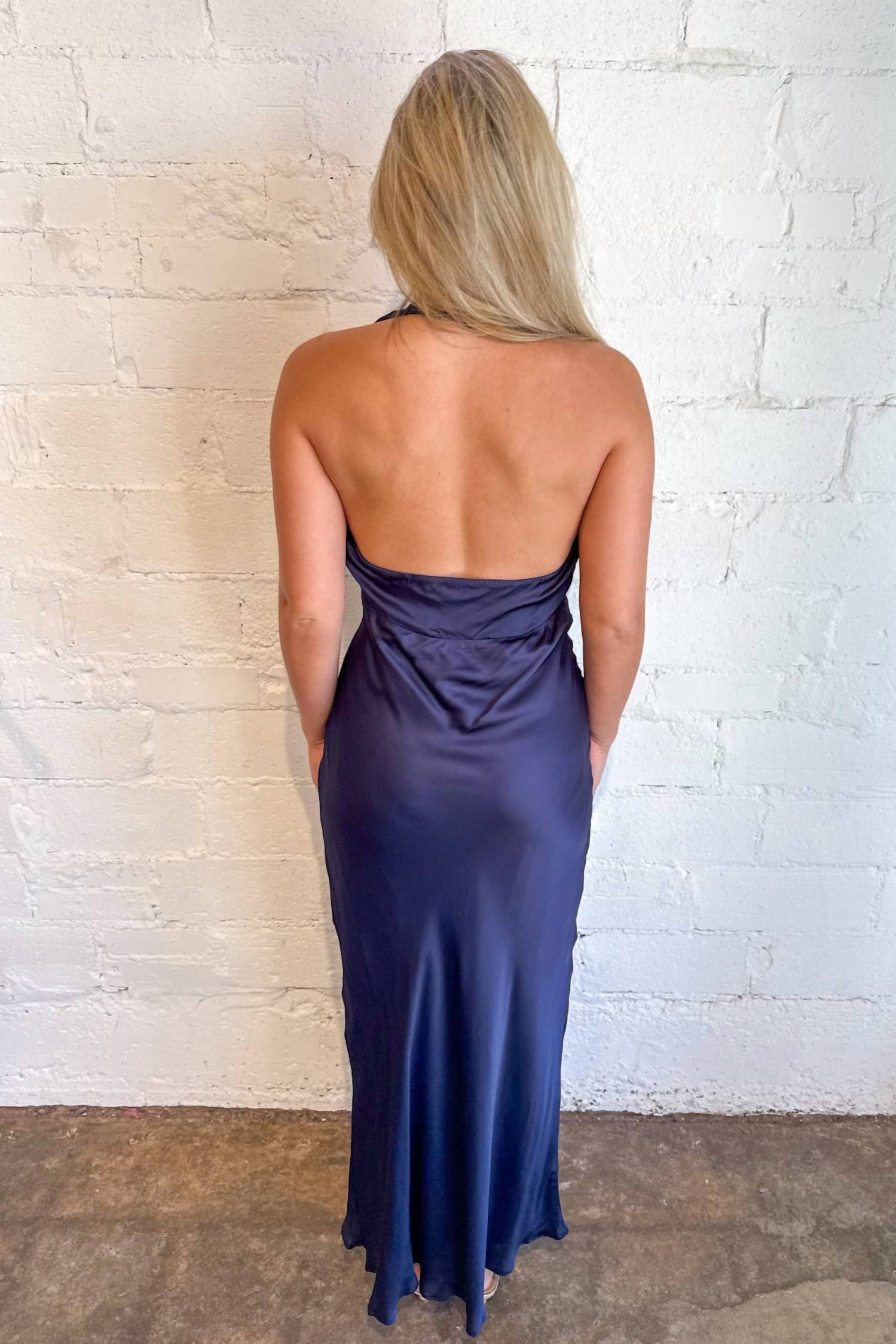 Introducing the Morrigan Ruffle Trim Halter Dress by ASTR The Label, an elegant choice for any special occasion. This sleeveless dress is composed of 100% Viscose, showcasing a solid navy pattern for a sleek look. Originating from an unknown country, it features a flattering halter neckline with a tie closure, adorned with delicate ruffle trims that exude feminine charm. Care instructions recommend dry cleaning only. Model Hannah is wearing a size Small (5'6" height, 33" bust, 25" waist, 34" hips).