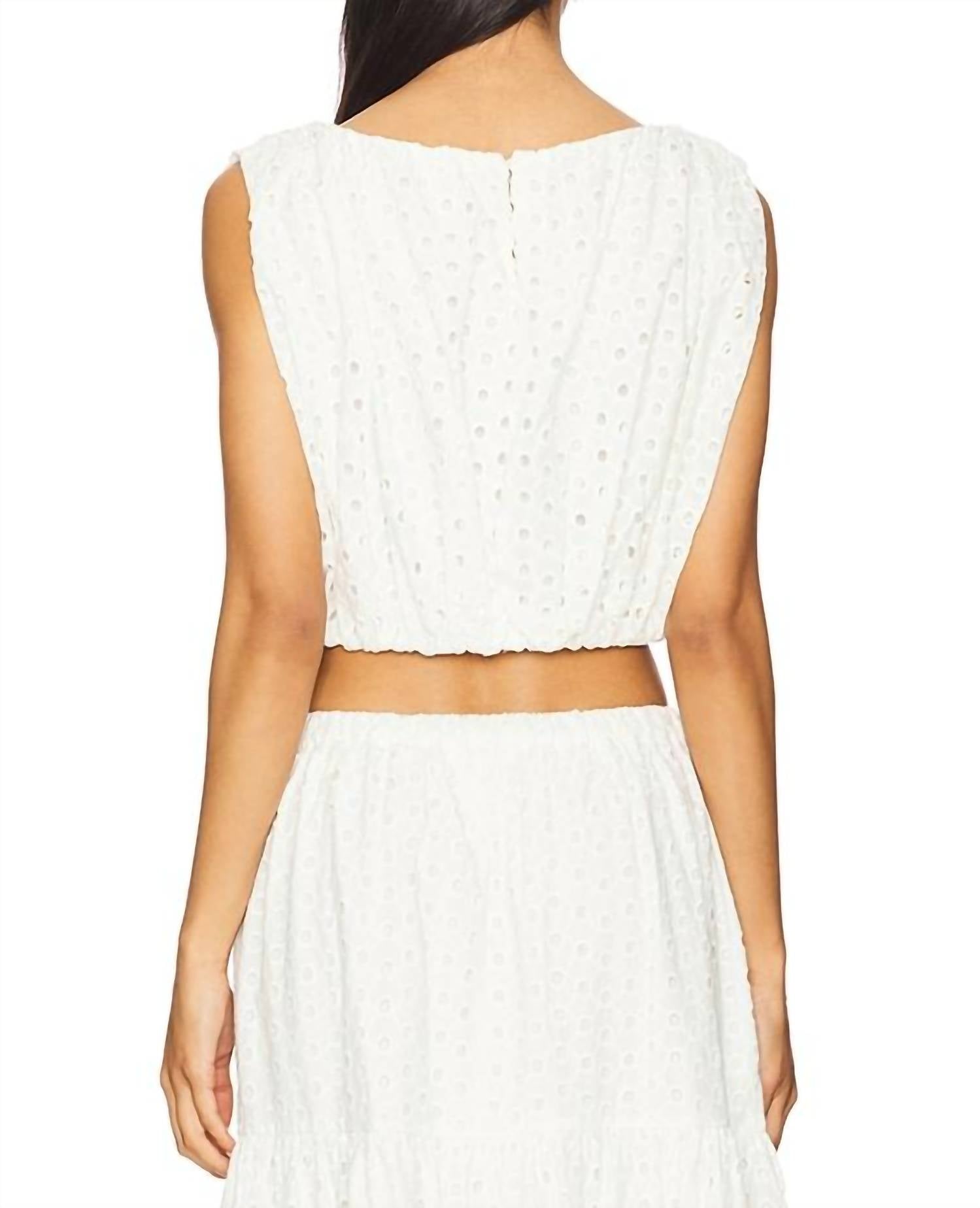 This cropped top is crafted from midweight linen fabric featuring intricate eyelet detailing for a textured, airy feel. It is designed with an elastic hem to create a flattering shape and a loop button closure at the back neckline for a clean finish. The piece is made from 100% cotton with a 100% rayon lining, making it a comfortable and stylish choice for warm-weather styling.