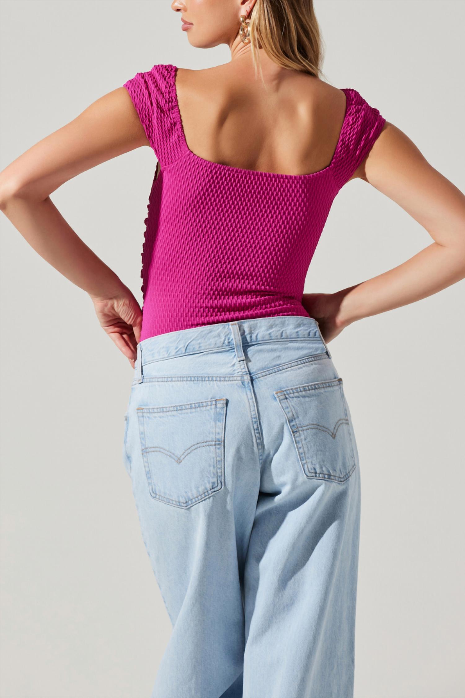 Introducing the ASTR Ninette Plunging Bodysuit, a women’s piece that radiates confidence in vibrant magenta. With cap sleeves and a sweetheart neckline, this bodysuit features a wire structure at the bust for optimal support and comfort. Ideal for any vacation or summer outing, the textured fabric adds a playful charm. This trend-setting bodysuit coordinates beautifully with high-waisted denim for an effortlessly chic look.