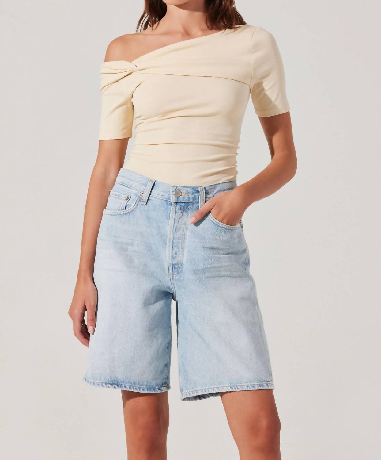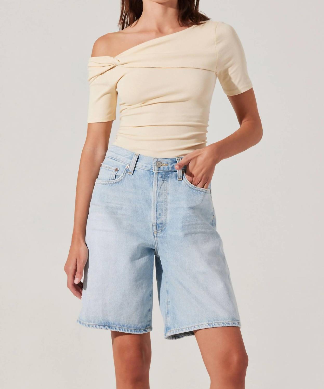 Pair this with your favorite jeans and slides for your next girls night out. Elevate your basics with the Saylah Off Shoulder Twist Top by ASTR the Label, a chic addition in classic cream. This top features short sleeves, an off-the-shoulder neckline with a distinctive knot detail, and soft side ruching for a body-hugging fit. Crafted from a comfortable 93% Cotton and 7% Elastane blend, it promises effortless style for any occasion. Closure: Pull-on. Care: Hand wash and line dry. Model is wearing size small with a true-to-size fit.