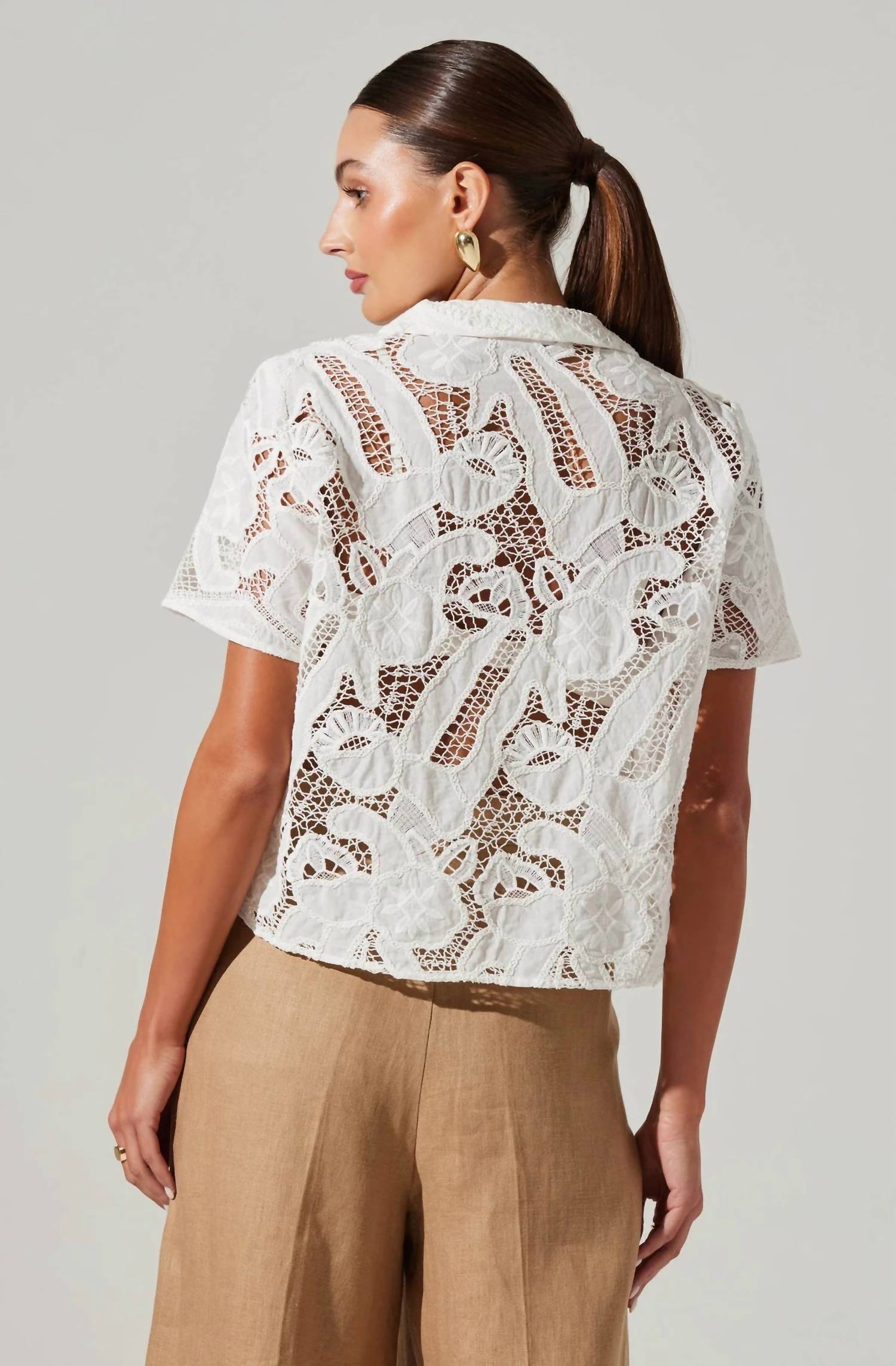 Uma blusa versátil que pode ser usada do escritório ao jantar! Eleve seu guarda-roupa de férias com o Tourist Top da ASTR, uma blusa branca chique, ideal para os dias casuais e ensolarados. Esta peça de renda floral apresenta mangas curtas e gola clássica, proporcionando um estilo moderno. Confeccionada em 100% algodão, possui fecho frontal por botões para facilitar o uso. Cuidados: Lavagem a seco. A modelo está vestindo tamanho P com as seguintes dimensões: Comprimento 54 cm, Busto 104 cm.