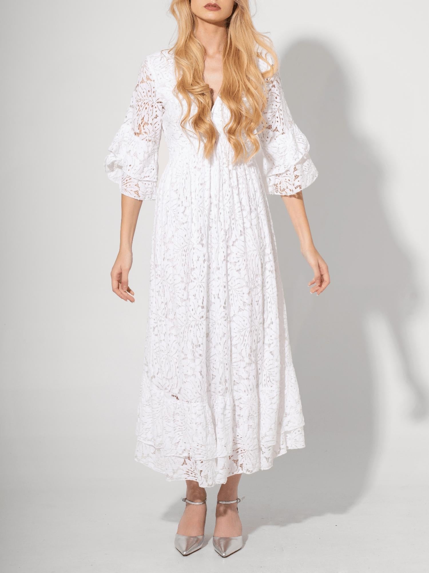 Style this maxi with your favorite statement necklace and sandals for the perfect look. Elevate your festive wardrobe with the Festival Maxi Dress by ASTRID, a boho chic piece in captivating white. This dress features three-quarter sleeves and an alluring V-neckline, beautifully crafted with a 70% cotton and 30% nylon blend. Designed in an A-line silhouette perfect for weddings and springtime gatherings, it exudes elegance and comfort. Care is simple: hand wash and lay flat to dry.