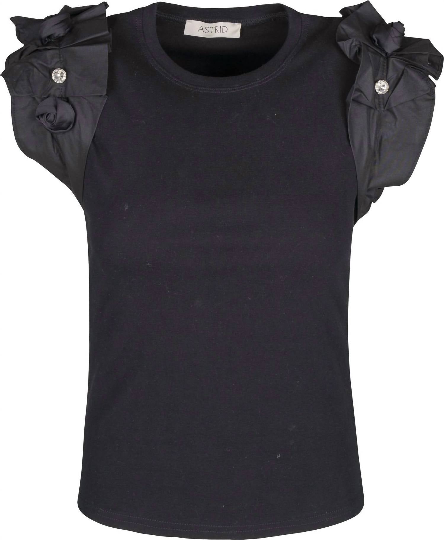 This is a black Astrid brand T-shirt with ruffled sleeves.
