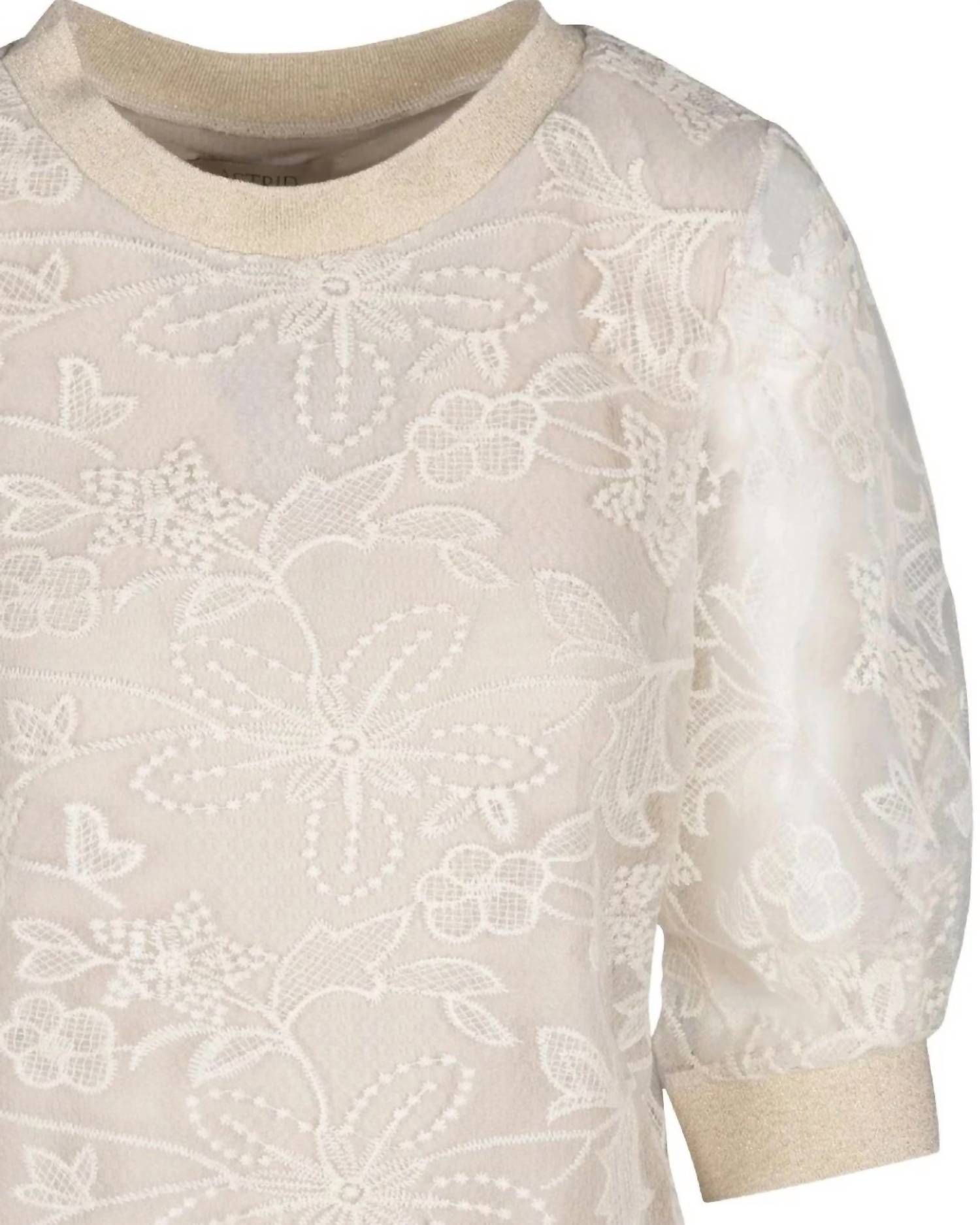 Elevate your wardrobe with the Women's Woven Lace Top by ASTRID, featuring a charming floral pattern in a delicate sand color. This vintage-inspired, three-quarter sleeve blouse is perfect for a variety of occasions, from spring outings to Thanksgiving gatherings. Designed with a classic crewneck, it seamlessly blends style and comfort. Whether for a vacation or everyday wear, this piece is poised to be your go-to choice.