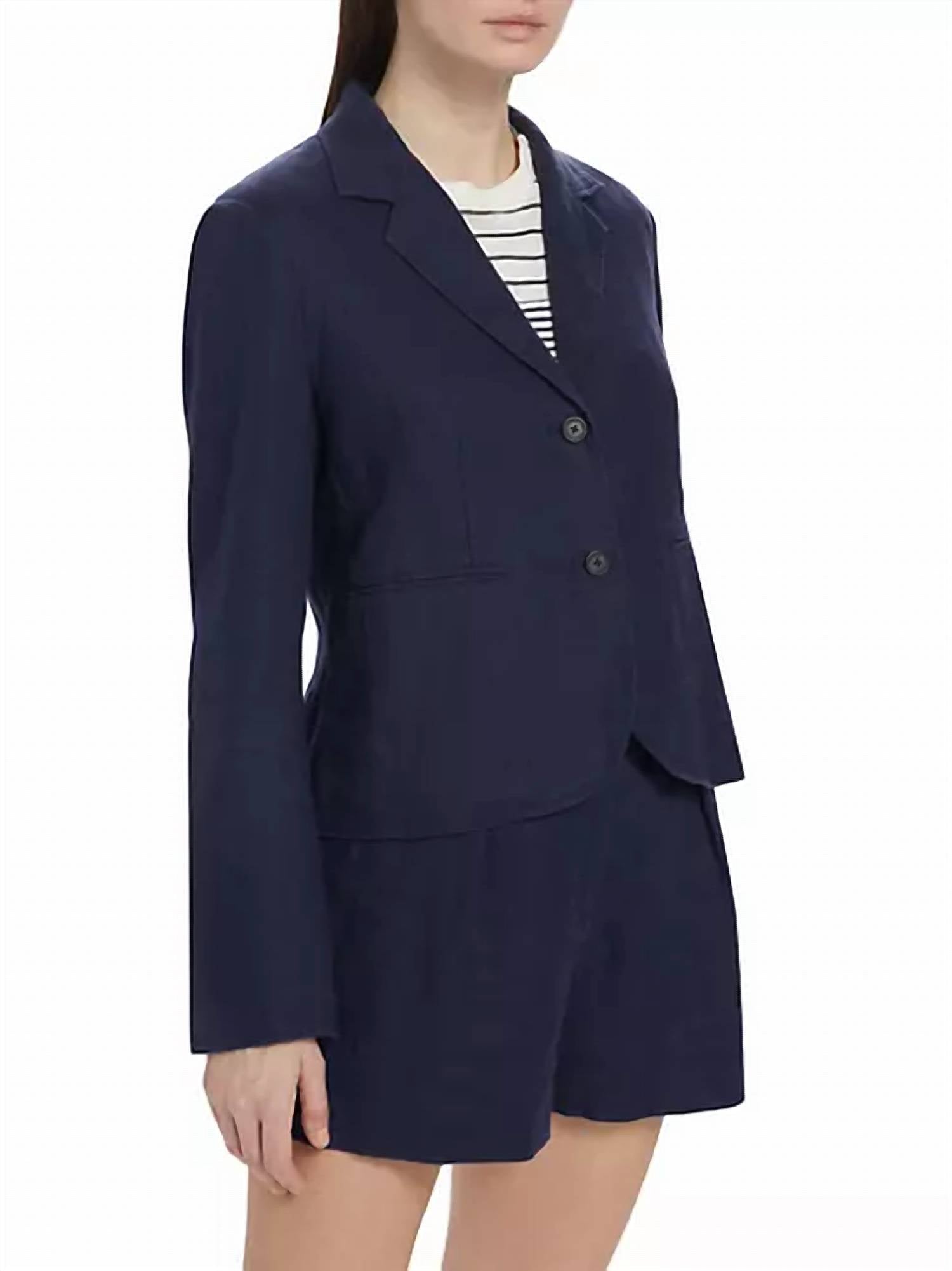 Apresenta um corte quadrado e abotoamento simples. Lapelas entalhadas. Mangas compridas, punhos vazados. Bolsos embutidos na cintura. Abertura nas costas. Fecho de dois botões. 55% linho, 45% algodão. Tamanho real. Lavagem à máquina - água fria.