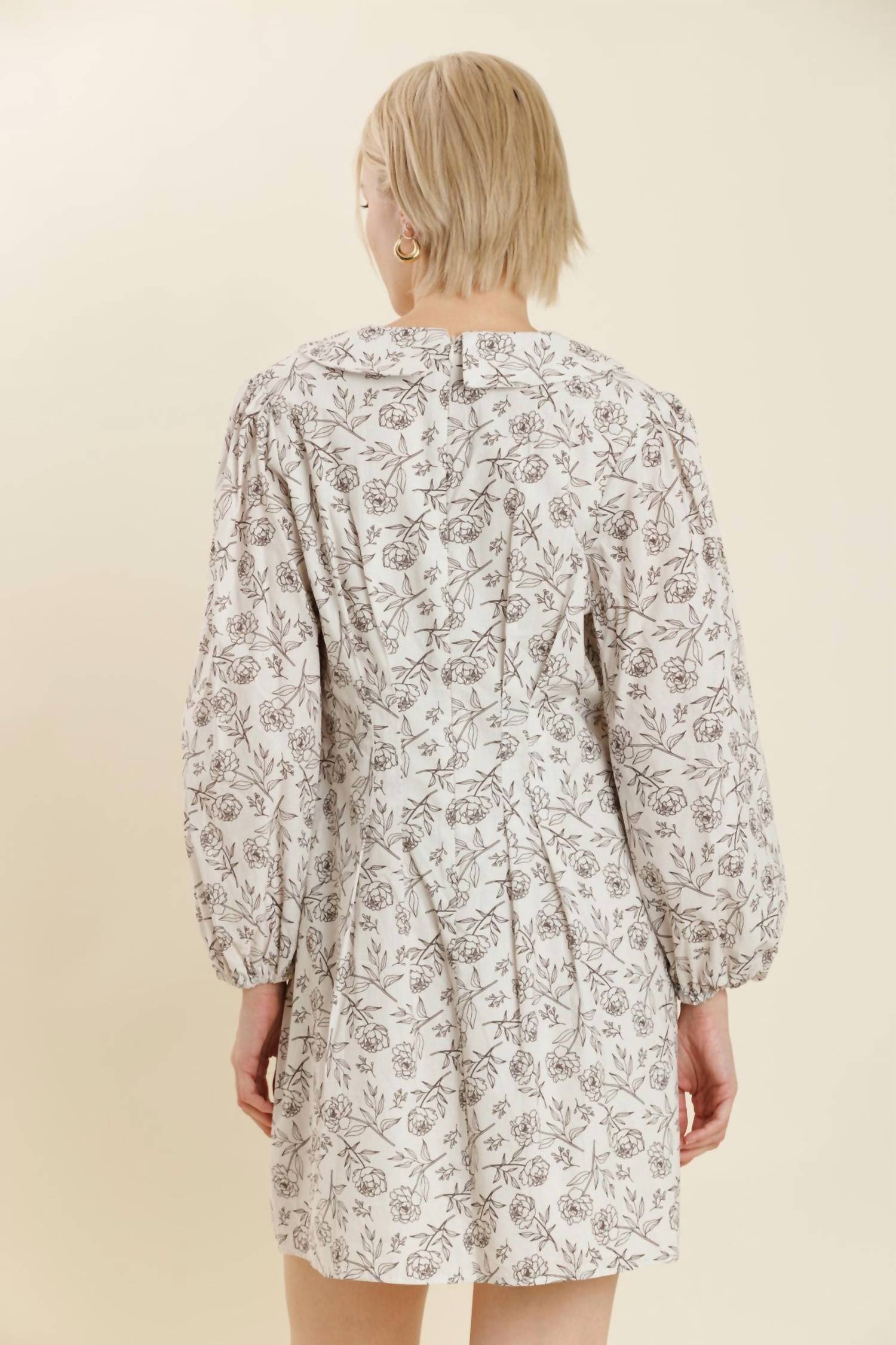 The kind of easy and flattering dress you'll be reaching for all season long. Introducing the Blakely Mini Dress by Aureum, crafted for a chic dinner party in a preppy spring style. This ivory sheath silhouette features long sleeves, a striking oversized collar with a contrast velvet tie, and a playful floral print. Made from non-stretch cotton poplin, it includes a pleated bodice detail and a zip closure at the back. Care: Machine wash. Model is 5'9" and is wearing a size small.