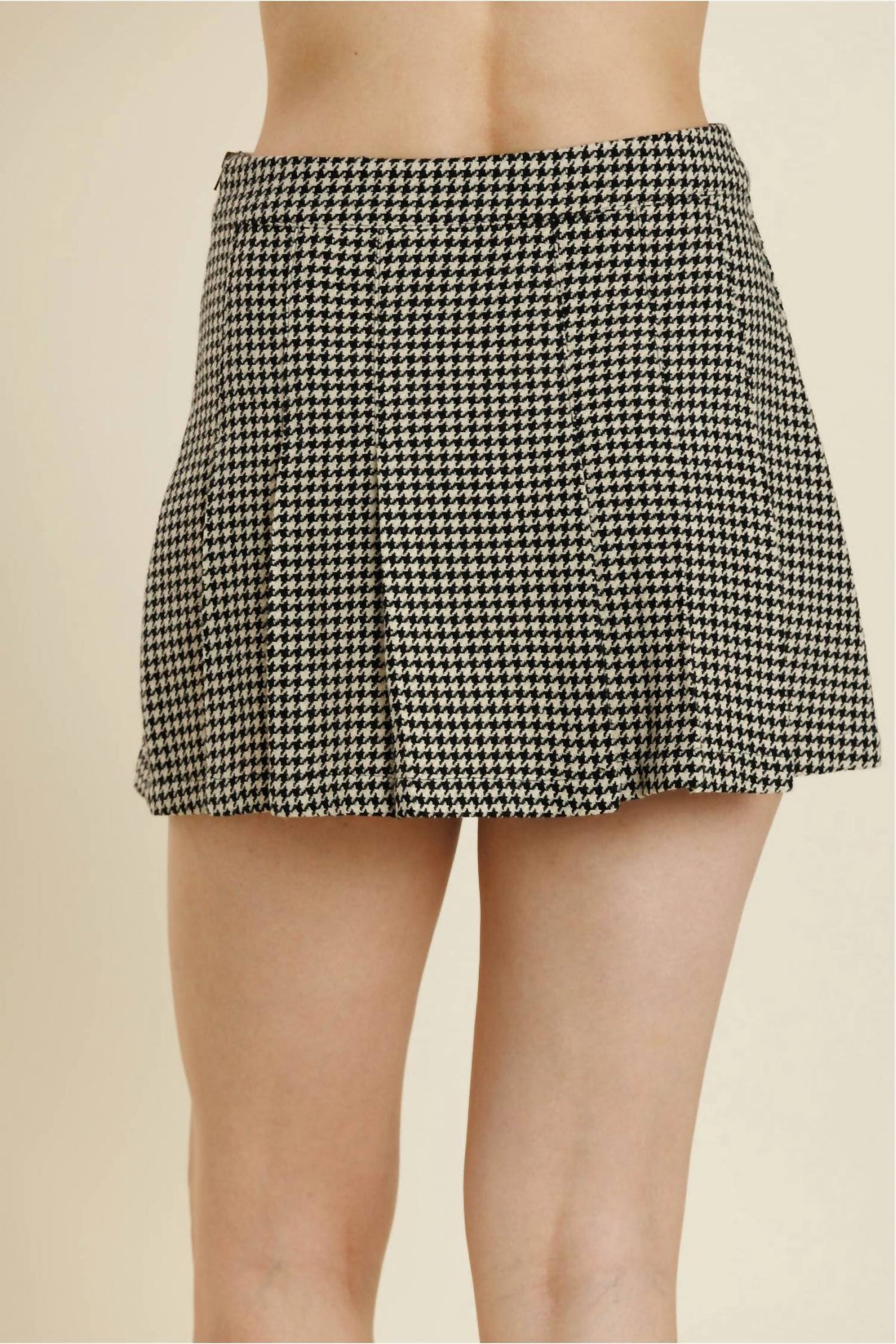 The Aureum Houndstooth Pleated Skirt is a preppy and stylish choice for any summer wardrobe. Designed with a non-stretch houndstooth weave, it features an accordion pleated skirt hem for a touch of classic elegance. This mini skirt is completed with a side zipper closure, providing a seamless fit. Simply machine wash to maintain its pristine look, perfect for back-to-school outfits. Model is 5'9" and wears a size Small.