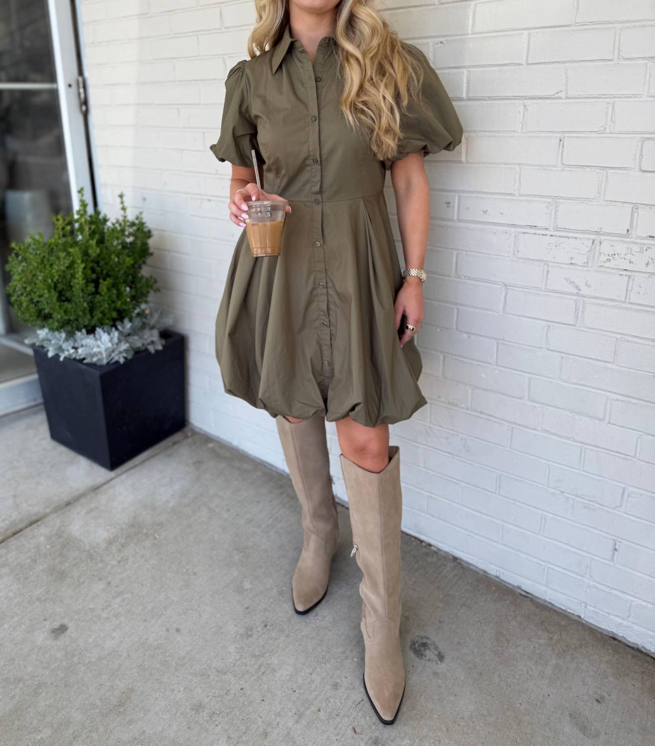 The kind of easy and flattering dress you'll be reaching for all season long. Introducing the Marie Bubble Hem Mini Dress by Aureum, a striking piece in elegant olive designed to elevate your summer style. This mini dress features short puff sleeves, a refined collar, and a button-front closure. The flattering pleated waist and playful bubble hem create a fit-and-flare silhouette perfect for minimalist engagement occasions. Made for women, this solid-patterned dress delivers subtle elegance for those moments you want to stand out.
