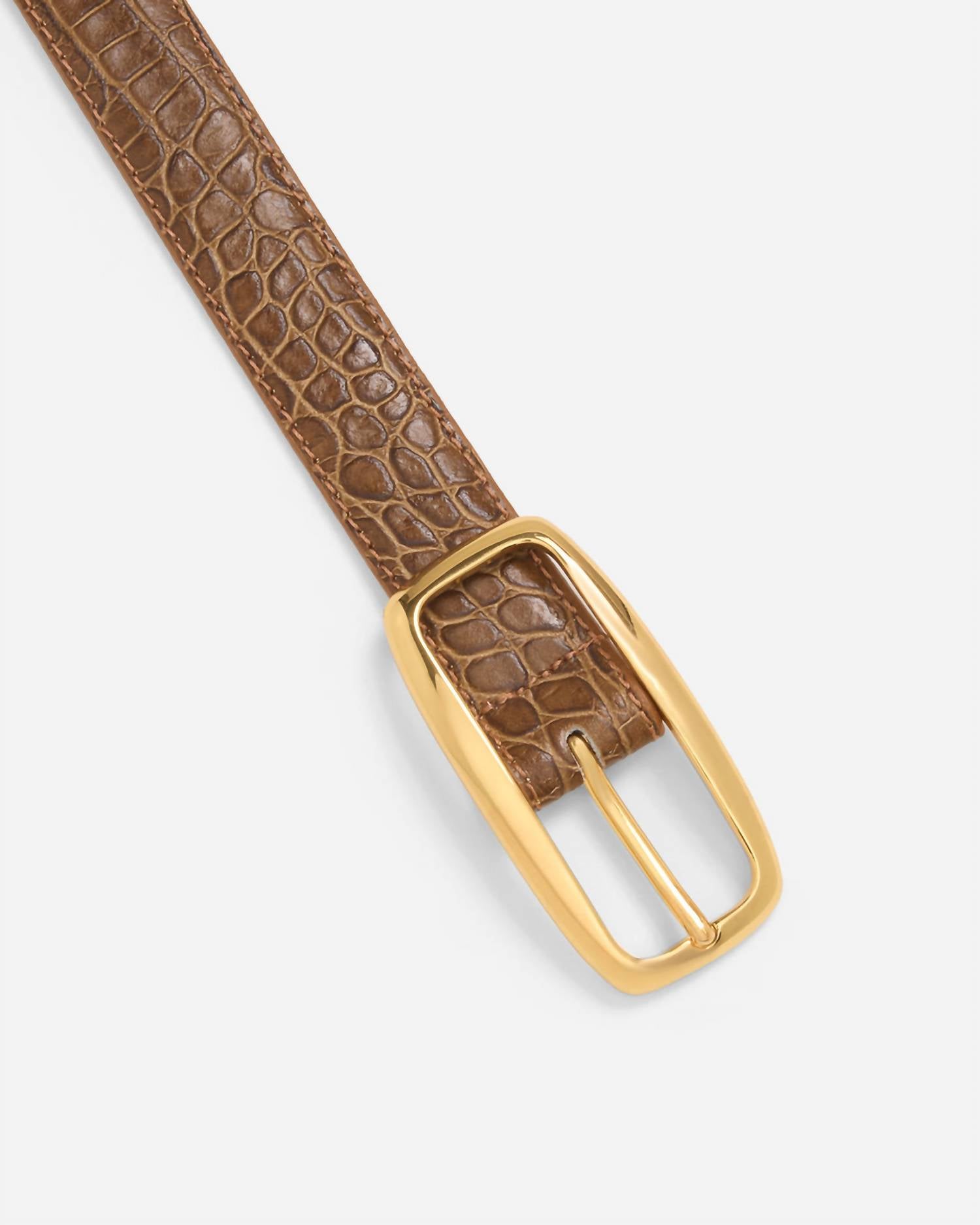Upgrade your accessory game with this stylish and versatile belt that will tie any outfit together. This must-have accessory is classic in its design and will never go out of style. Explore sophistication with the Women's Leather Belt by Aureum, handcrafted in Italy from genuine Italian leather, bringing a touch of luxury to your wardrobe. This exquisite belt showcases a crocodile embossed design in Tuscan Croc & Gold, accented by a custom molded silver tone buckle. With an adjustable fit through its 5 holes, the belt offers a strap width of 1" (3 cm) for both comfort and style. Elevate any outfit effortlessly with this timeless piece.