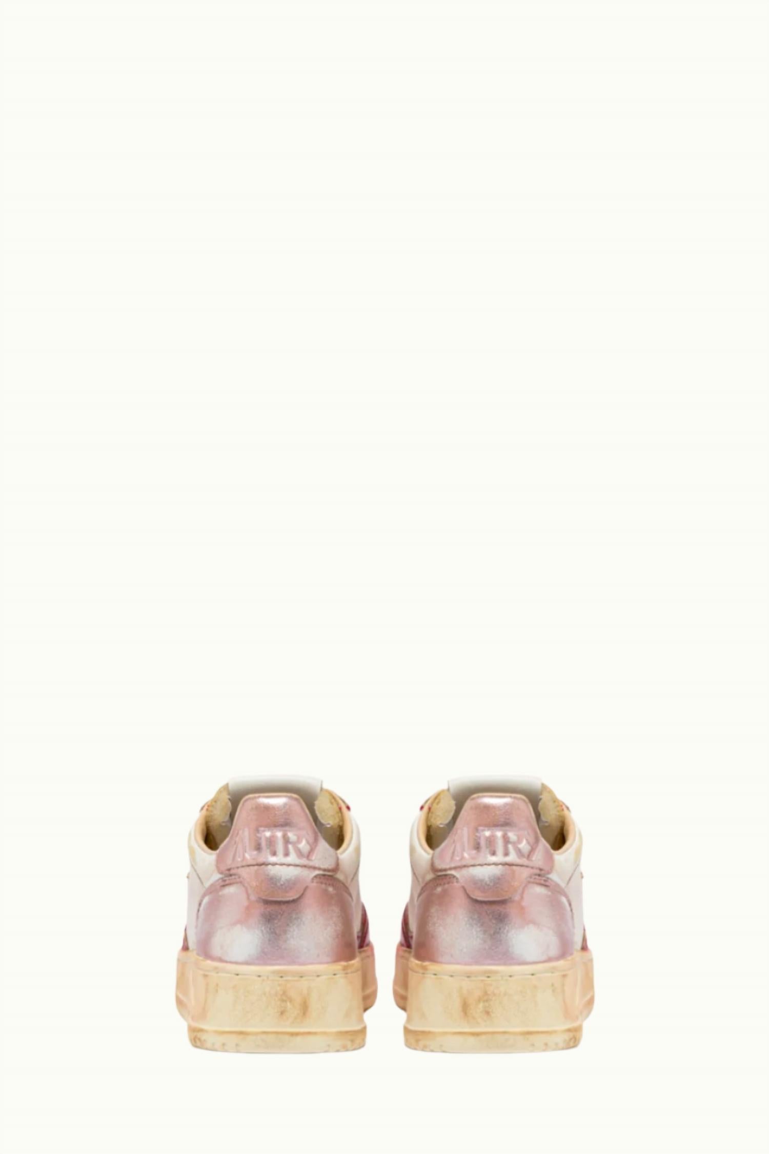 Step into street style with the Women's Super Vintage Low Sneaker by AUTRY, crafted with an upper of 100% leather in a striking red/pink shade. Featuring a round toe with micro-perforation, these sneakers boast a padded collar and used-effect cotton laces for a touch of rugged charm. Experience comfort with a 2-cm raised sock-liner and a durable 100% rubber sole, with a height varying from 2.5-3.5 cm. Lined with a blend of leather, terry, and nylon, these sneakers sport an embroidered label on the tongue, ideal for summer.