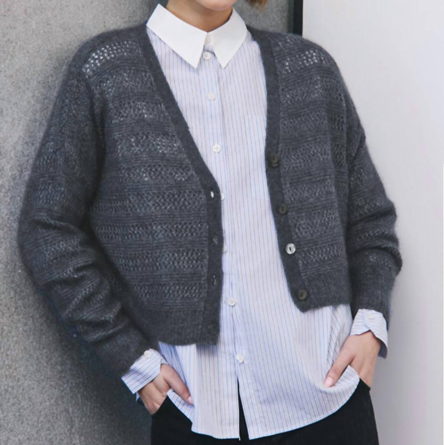 This charcoal grey cardigan offers an effortlessly chic layer with its airy knit texture and cropped silhouette. The soft, cozy fabric is perfect for transitional weather, pairing beautifully over shirts or dresses. Featuring a button-down front and subtle patterning, it brings timeless elegance to your wardrobe staples.