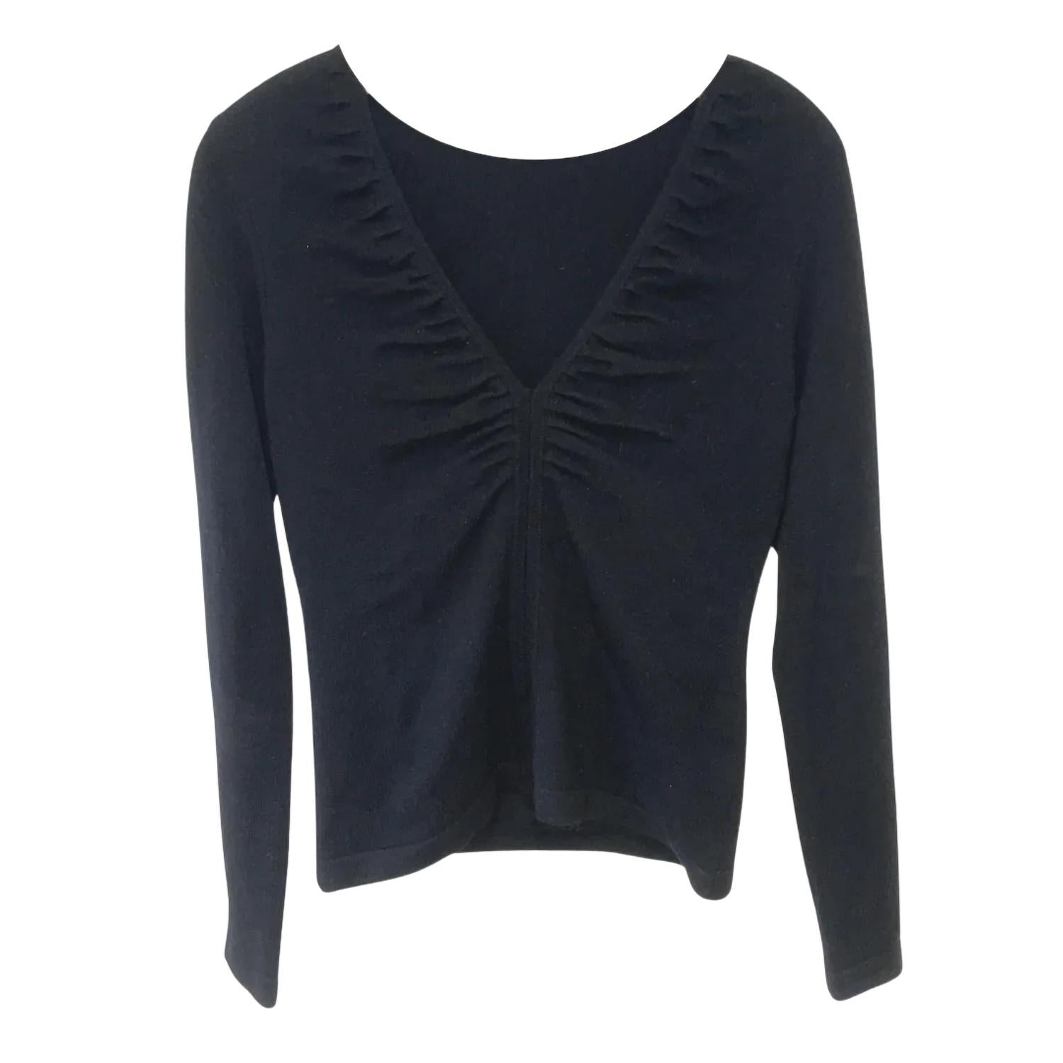 Not your basic black sweater, this form-fitting pullover top is designed with a ruched seam down the center front V-neck. Just enough detail to make you stand out in the crowd.