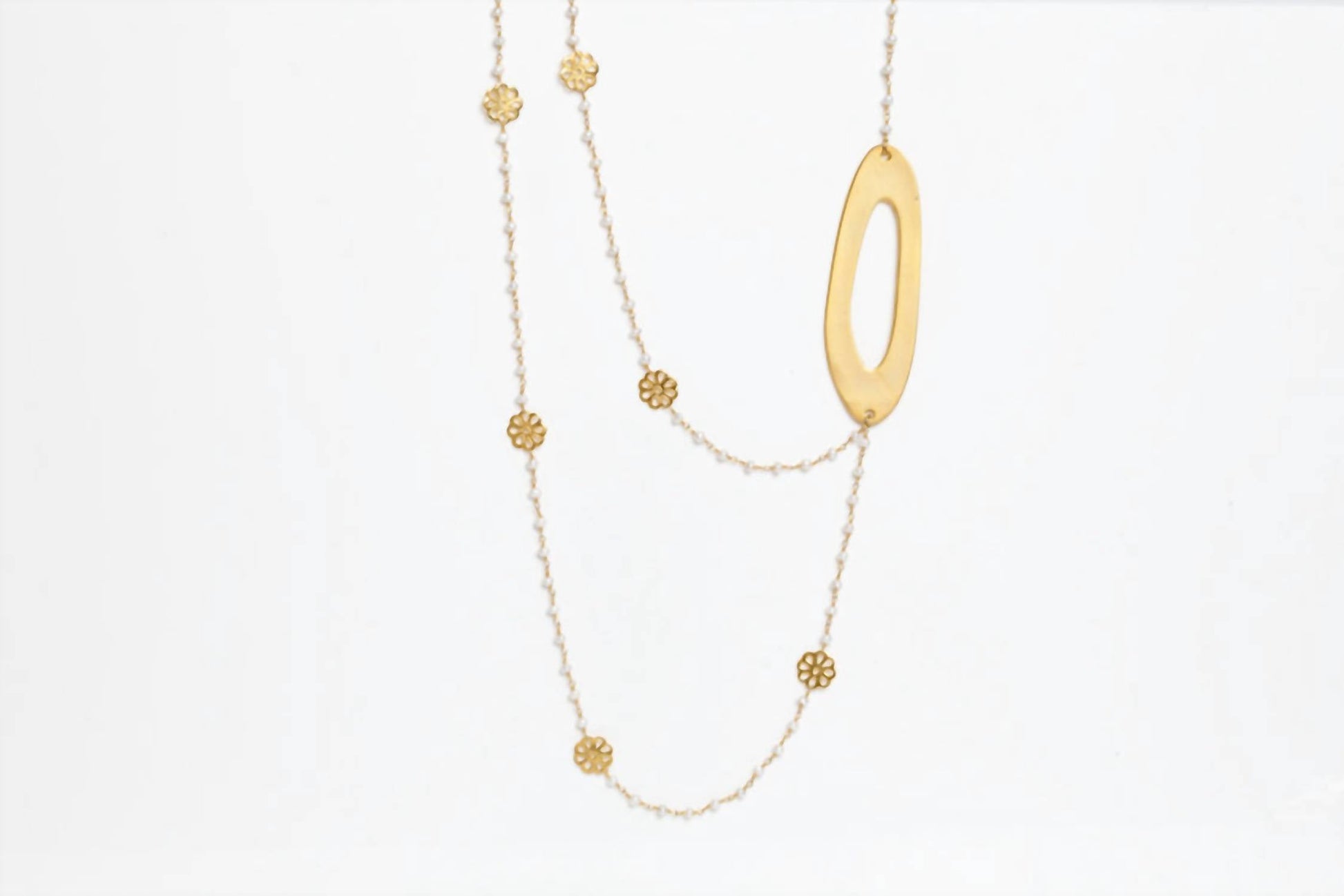 Stunning piece featuring a 24kt gold-plated double layer design. Showcases a delicate combination of gold plating and pearlescent beads. Perfect for adding a touch of sophistication to any outfit, stylish and luxurious finish makes it an essential accessory.