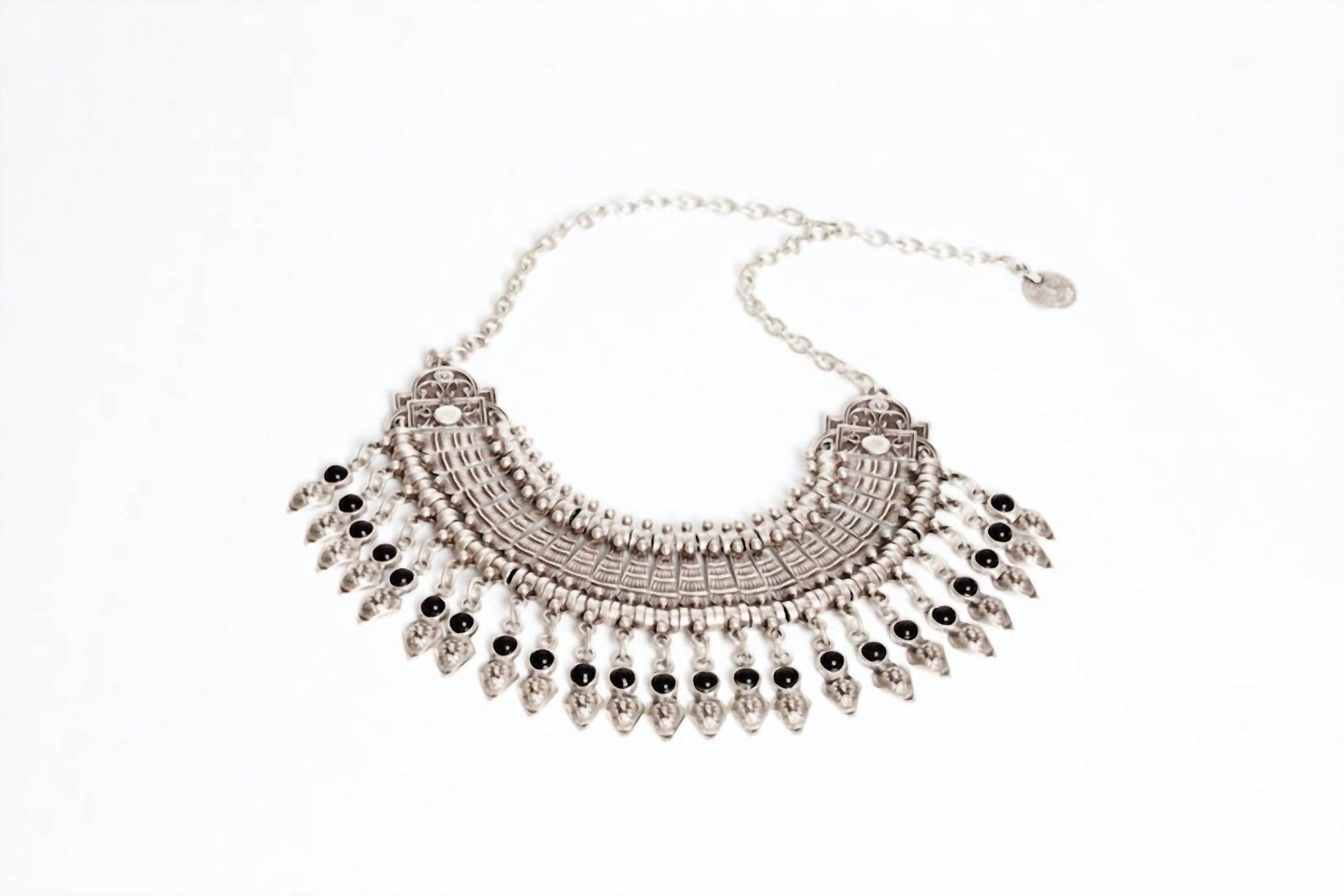 Elevate your accessory collection with the Women's Statement Onyx Gypsi Necklace by Avenue Chic. Crafted from high-quality sterling silver, this eye-catching piece features striking black simulant stones in a bead setting, exuding sophistication and style. Versatile and elegant, it's the perfect costume jewelry to make any outfit pop.