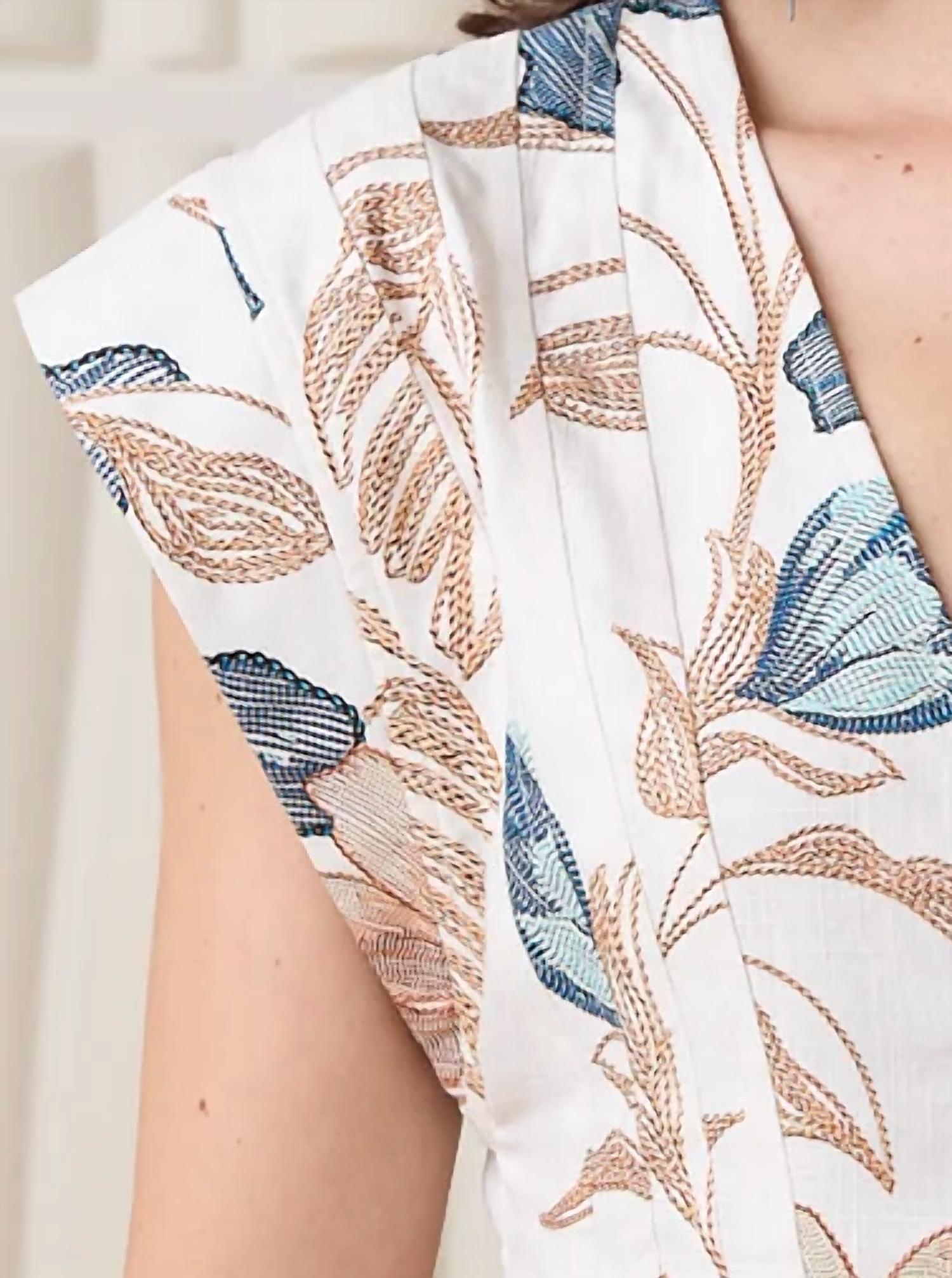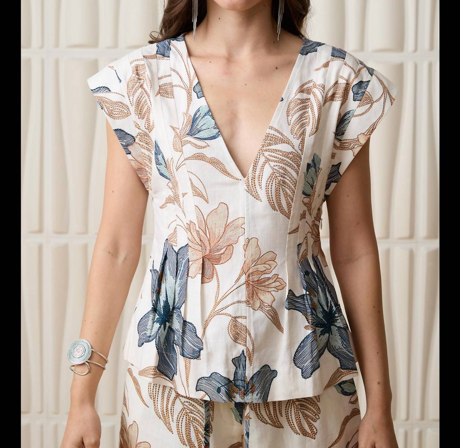 A timeless blouse that will never go out of style. Introducing the Zanzibar Top by Aylaya, the perfect addition to your summer holiday wardrobe. This blouse showcases a vibrant hibiscus denim floral pattern with a flattering V-neckline and chic cap sleeves, ideal for any festive occasion. Designed specifically for women, this piece is crafted to elevate your style effortlessly. Please note washing and drying instructions are not provided; follow customary care for delicate fabrics.