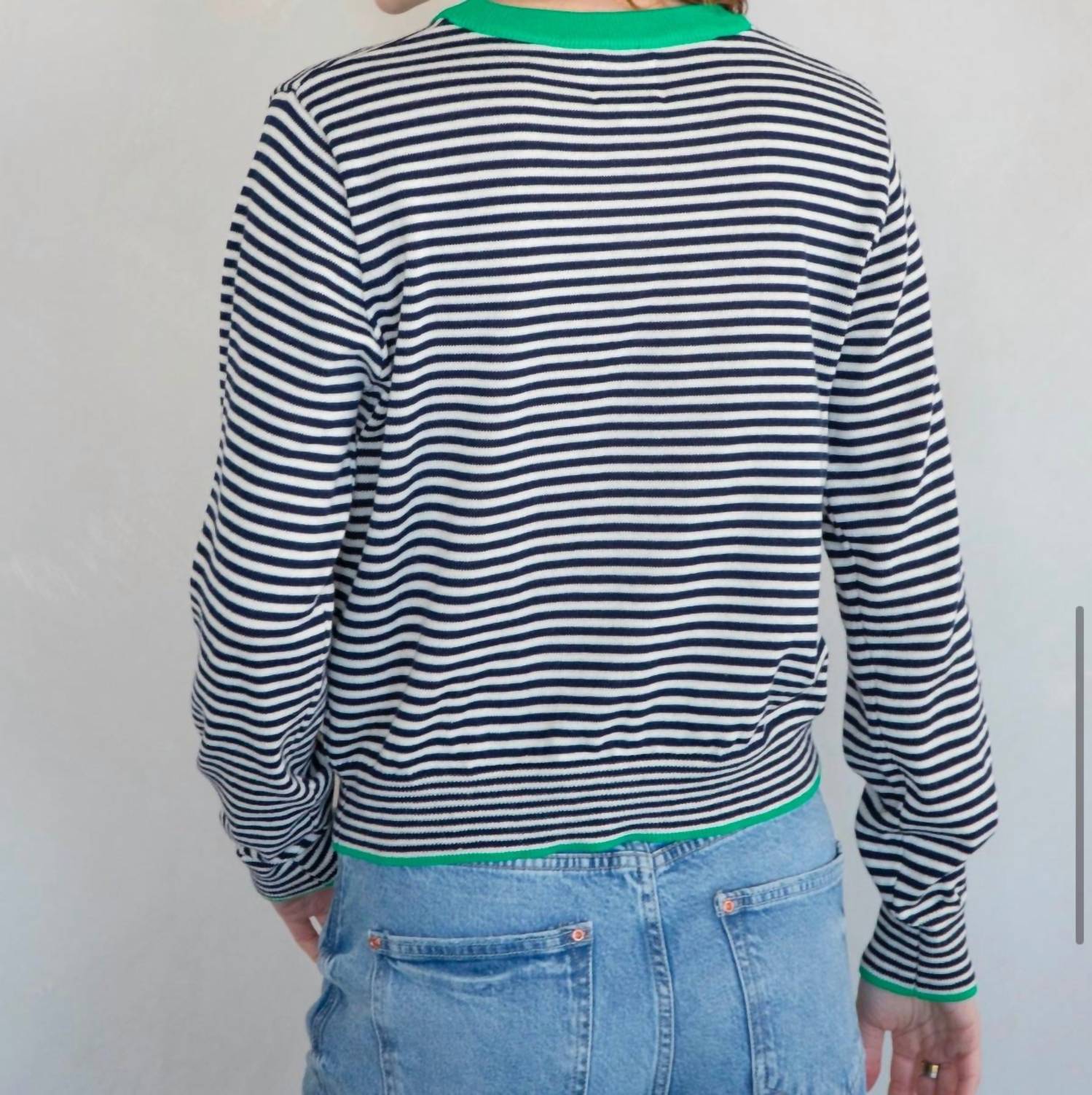 Um ajuste clássico que funciona tão bem abotoado quanto aberto. Uma adição chique ao seu guarda-roupa de inverno, perfeita para viagens. Cardigan feminino de manga comprida com estampa clássica de listras azul-marinho, gola careca e acabamento contrastante em verde vibrante. Confeccionado em malha macia e respirável. Oferece conforto o dia todo com fecho de botão versátil para um estilo adaptável. Lavar somente à mão.