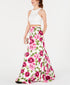 Aproximadamente 155 cm de comprimento do centro das costas até a bainha. O comprimento é baseado no tamanho 9/10 e varia 1,9 cm entre os tamanhos. | Decote halter | Zíper nas costas em ambas as peças | Design de duas peças: top curto de renda com bojos moldados e saia com estampa floral e bolsos na costura; acabamento em crinolina