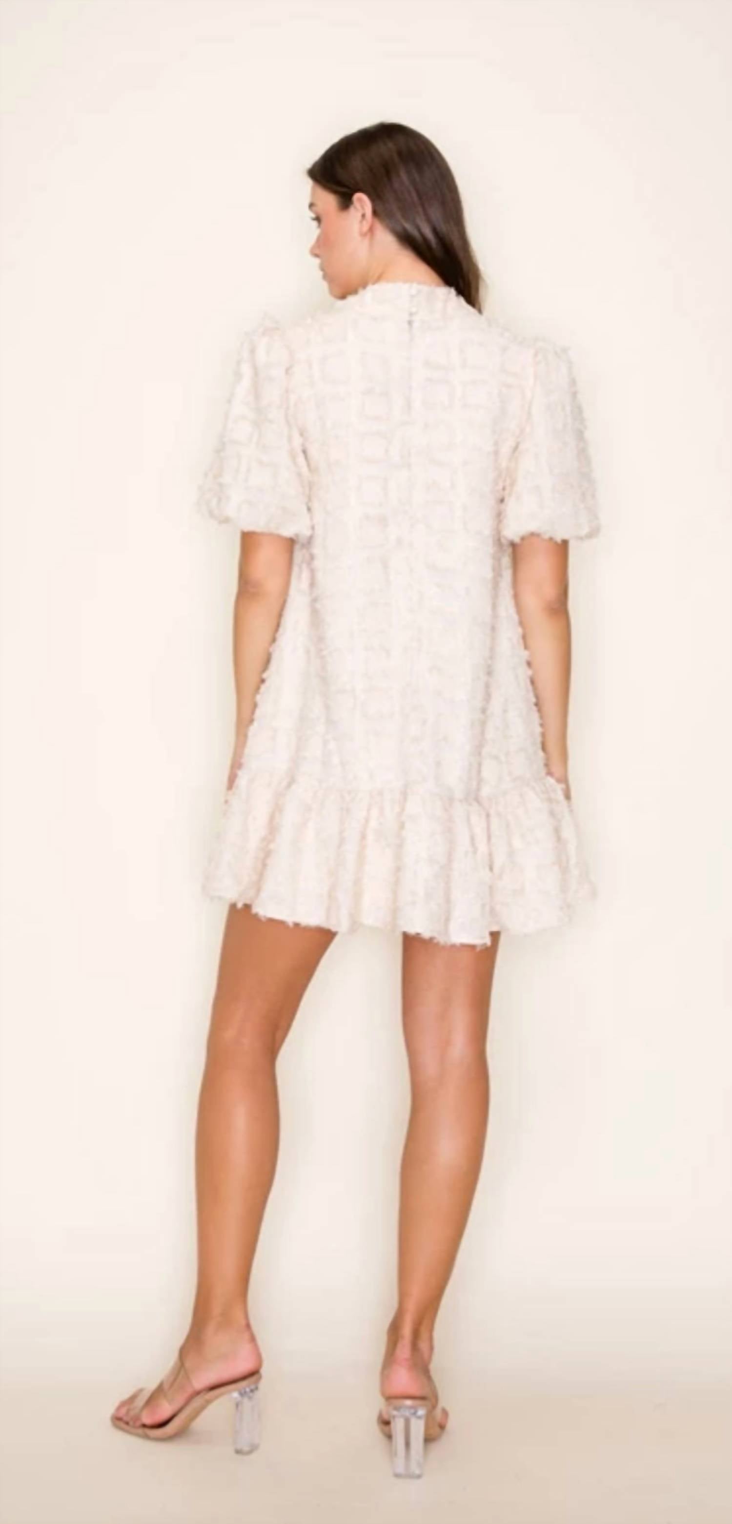Introducing the Graceful Puff Sleeve Ruffle Dress by B.right, a chic choice for your holiday party. This Taupe mini dress, perfect for a Spring celebration, features short puff sleeves and a classic crewneck, offering a timeless vintage vibe. Its shift silhouette and textured pattern exude elegance, ensuring you stand out in style. Origin details and care instructions are not specified, prioritizing the dress's striking design for effortless sophistication this Christmas season.