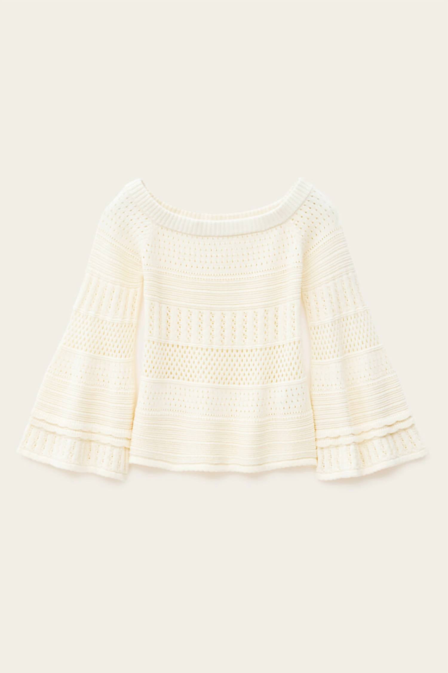 Experience effortless elegance and comfort with the Daxie Long-Sleeved Pullover by ba&sh, a must-have for any summer wardrobe. This beige pullover features long wide sleeves and a chic off-the-shoulder neckline with ribbed trim, offering a breezy openwork texture perfect for a boho chic vibe. Crafted from 100% organic cotton and made in Italy, this garment provides both sustainability and luxury. Designed with a pull-on closure, it is easy to wear and can be machine washed for convenient care.