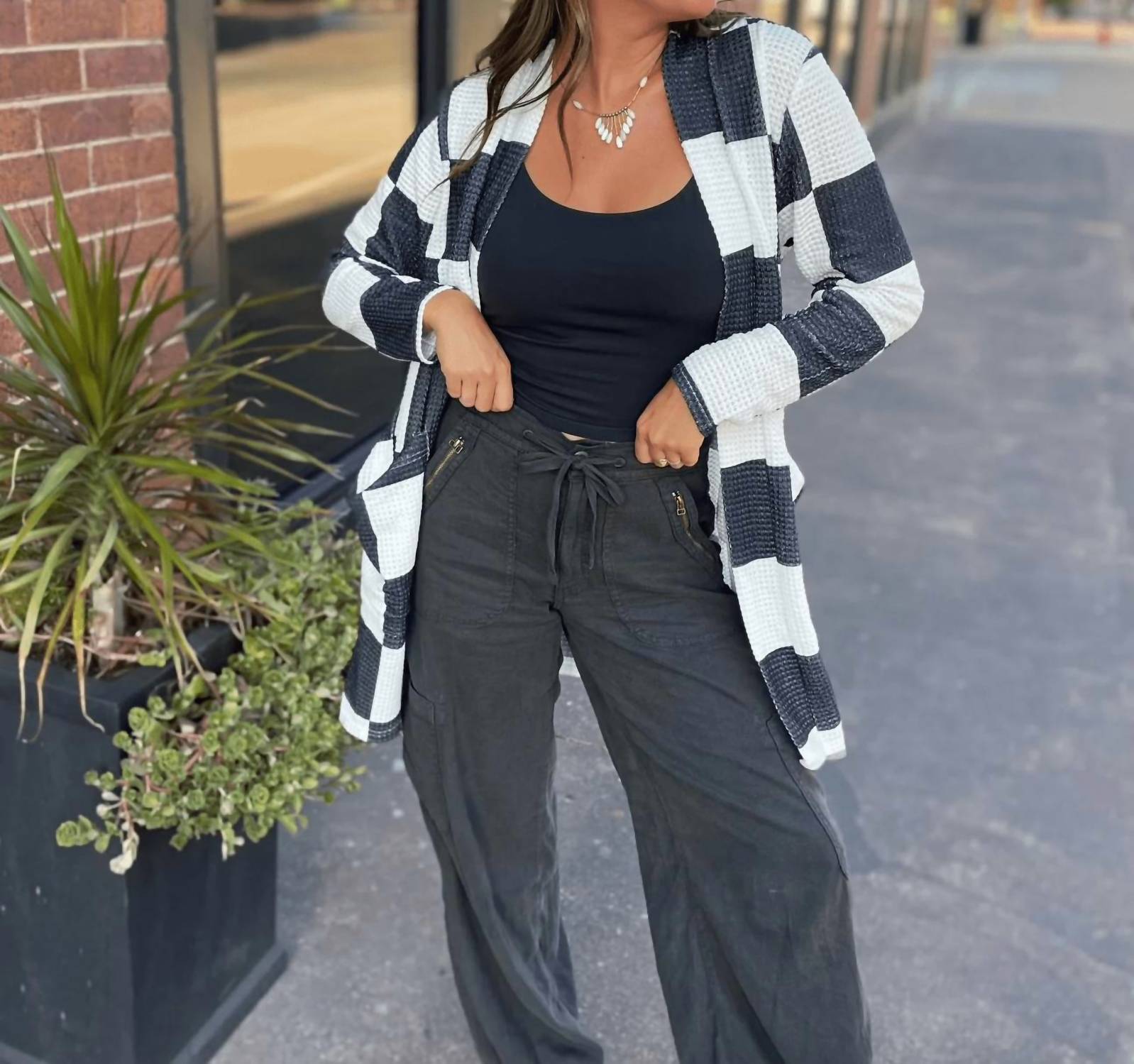Elevate your wardrobe with the Rally Check Cardigan by BABE WHOLESALE CO., designed for a chic and versatile look. This black and white check cardigan features long sleeves and a classic v-neck, perfect for adding a touch of vintage-inspired flair to your ensemble. Its waffle knit construction is both lightweight and stylish, complete with practical front pockets and a convenient button closure. Care: Machine wash.