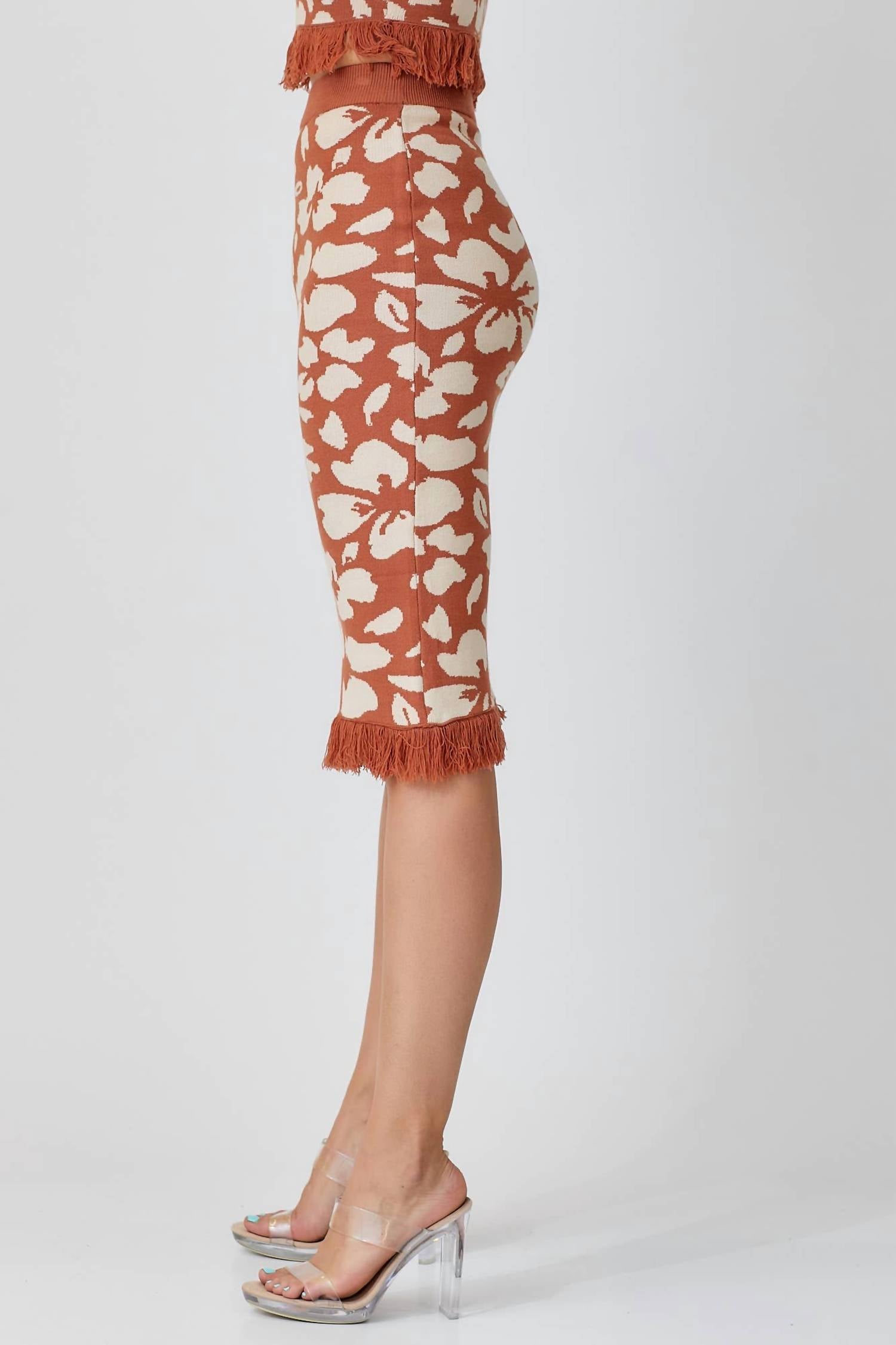 Elevate your summer wardrobe with the Tulum Nights Knit Skirt by Baevely. This brown midi skirt showcases a tropical floral pattern and fringe detailing, perfect for adding a touch of vacay glam. Crafted as a pull-on design, it ensures both comfort and a flattering fit. Ideal for boho chic styles and vacation occasions, this skirt is a staple for any fashion-forward woman.