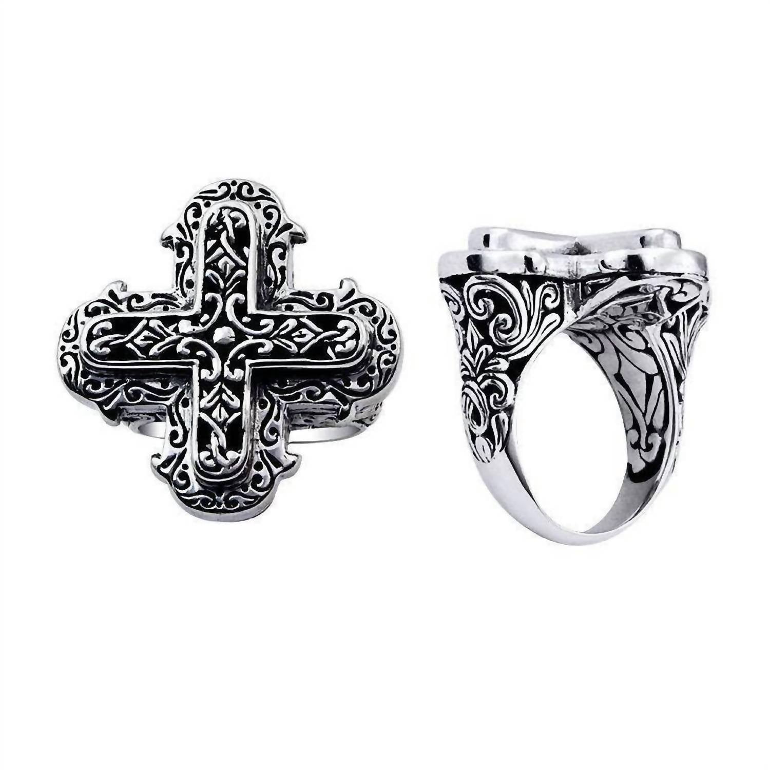 The Women's Cross Shape Scroll Statement Silver Overlay Ring by BALI is a striking piece in silvertone, perfect for adding elegance to any outfit. This fine jewelry ring features a unique cross shape design and is crafted with silver overlay, emphasizing its intricate scroll details. Available in size 9", this piece is sure to make a statement. Although the stones are simulant, the craftsmanship is nothing short of authentic.